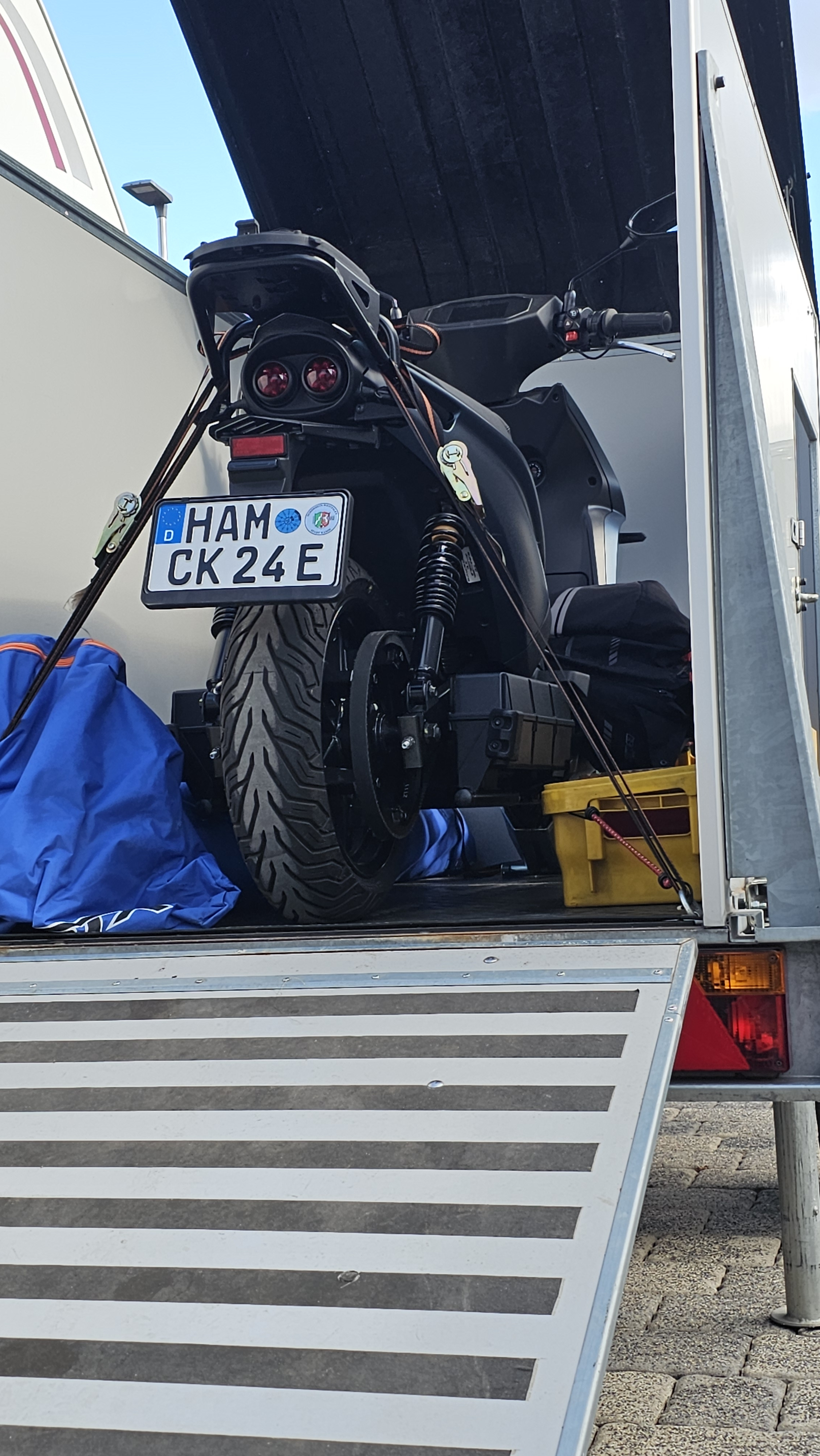 Vorweg kann ich schon mal sagen, dass das Einladen total entspannt war. Mit etwas Gas ging es ganz easy die Rampe hoch bis in den Vorderradständer. Dann noch 4 Spanngurte und fertig 👍