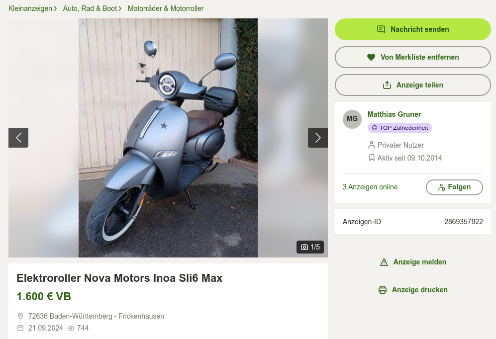 Der 75 km/h-Roller von Nova-Motors, der Inoa SLI-6 Max wäre mit 1.600 € VHB preislich auch noch sehr interessant: