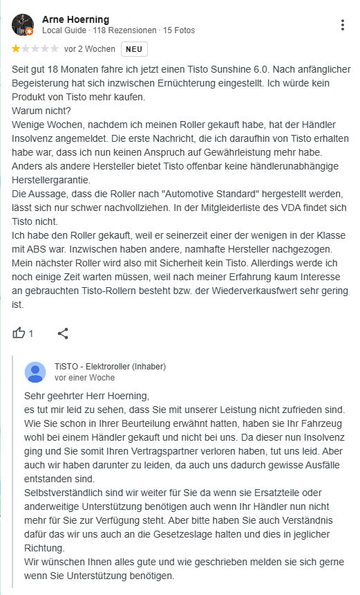 Unabhängig davon weiß ich auch gar nicht, welcher Händler sich überhaupt den Ärger macht und Roller von Tisto verkauft.