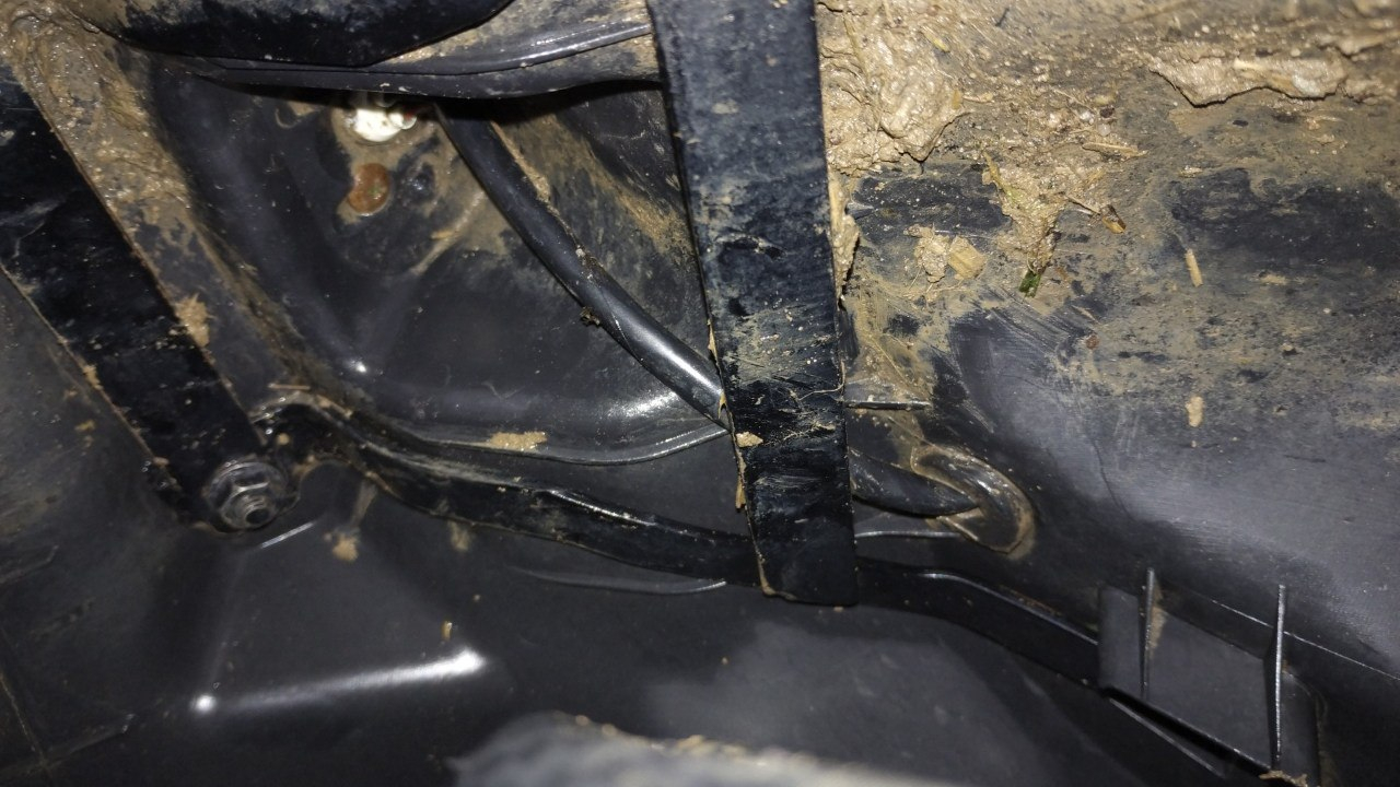 Und die Kabel zur Birne gehen in dieses weiße Gummi rein, von unten auf der Innenseite des Kotflügels, wo sie wirklich allem komplett ungeschützt ausgesetzt sind.