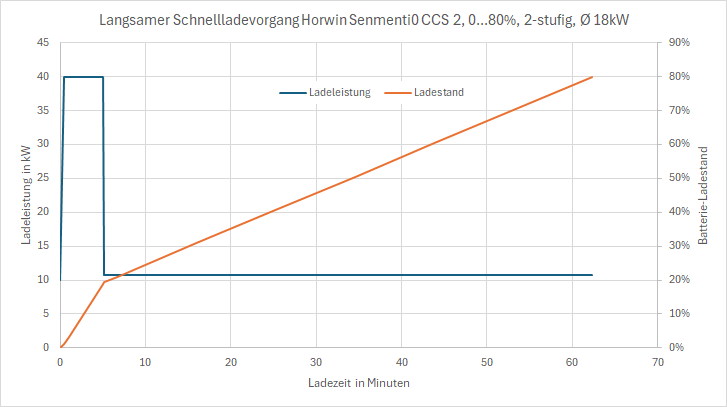 Die ersten 5 Minuten wird voll geballert mit 40kW, was die Batterie schnell aufheizt, weit jenseits der möglichen Kühlleistung im Senmenti 0. Danach fällt die Ladeleistung steil ab, mit ab den ersten 5 Minuten durchschnittlichen 18kW bis 80% Ladestand. Ob kontinuierlich fallend wie hier, oder in Stufen fallend wie bei Mosts Skizze (und leider bei den Chinesen beliebt