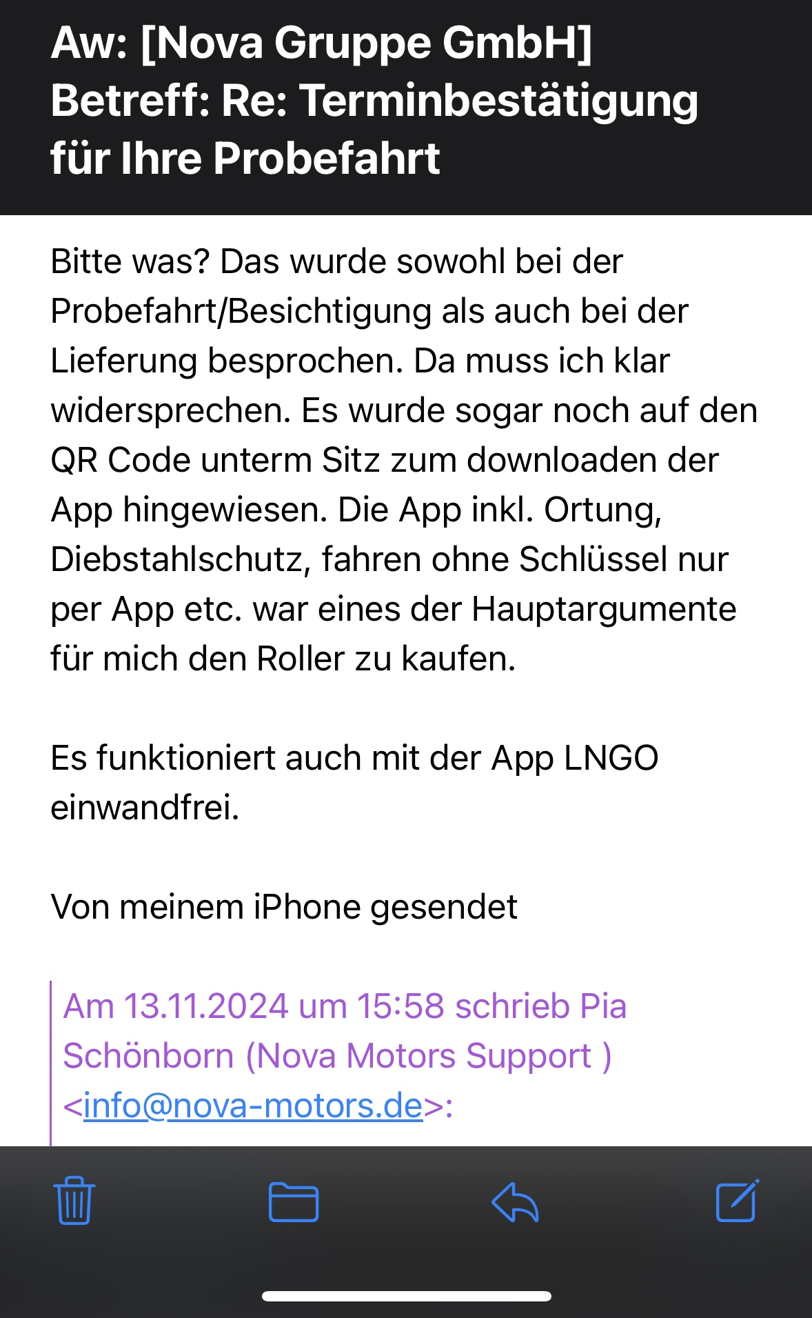 Hier mal die Bilder und auch die Kommunikation mit dem Nova Support. Diese Aussage bzgl. der App ist schon sehr frech. Das war ein Hauptargument für mich.