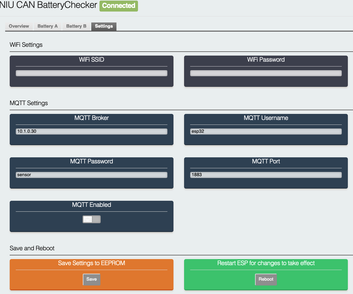 Dann hat man die Wahl ob der T-CAN ein WLAN AP aufmacht, um die Akkudaten per Webbrowser (und damit herstellerneutral) zu checken oder ob man mit einem vorhandenen WLAN verbinden und den MQTT Dienst verwenden möchte. Dies will ich im Laufe des Dezembers umsetzen, dass wäre dann der Sweetspot zwischen ich kann schnellladen UND bekomme alle Daten aus den Akkus, ohne neu compilieren der Firmware, um das Verhalten zu ändern etc. Wenn du darauf auch Bock hast gib mir noch ein bisschen Zeit, ansonsten kann man die Teile natürlich auch easy per USB flashen.