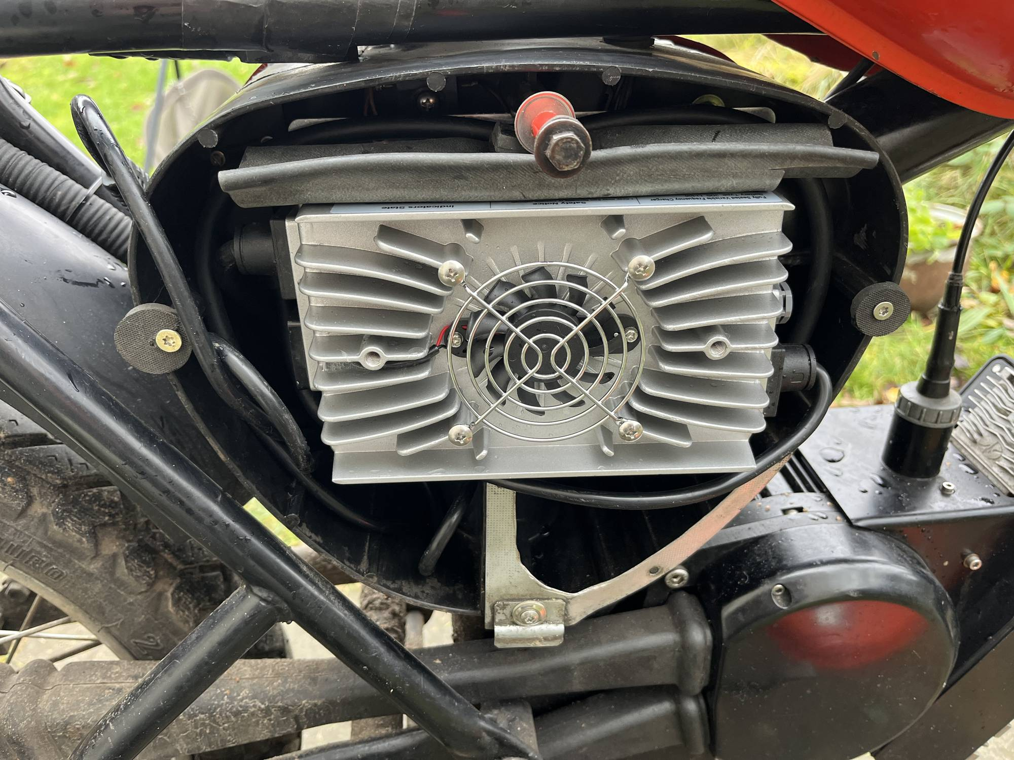 Es gibt auch noch einen Nutzer, der gerade einen Zusatzakku in den kompletten Herzkasten einbaut. Auch ein schöner Ansatz, da niedriger Schwerpunkt und Platz für 200 Zellen. Ich hab' den Herzkasten aber schon recht gut in Verwendung. Links ist eine große Gliederkette drin und das auf Sicherheitsschloss umgebaute originale Zündschloss mag ich auch. Rechts ist ein spezielles Ladegerät drin, was ich mir hab' aus China kommen lassen. Ist eins wie es für die Surron angeboten wird, wasserdicht, kompakt und mit 800W.