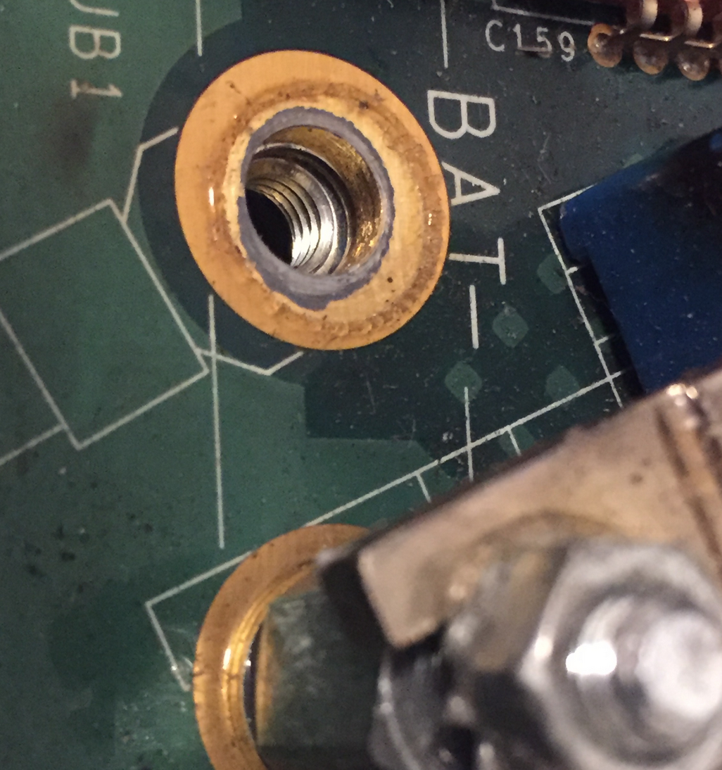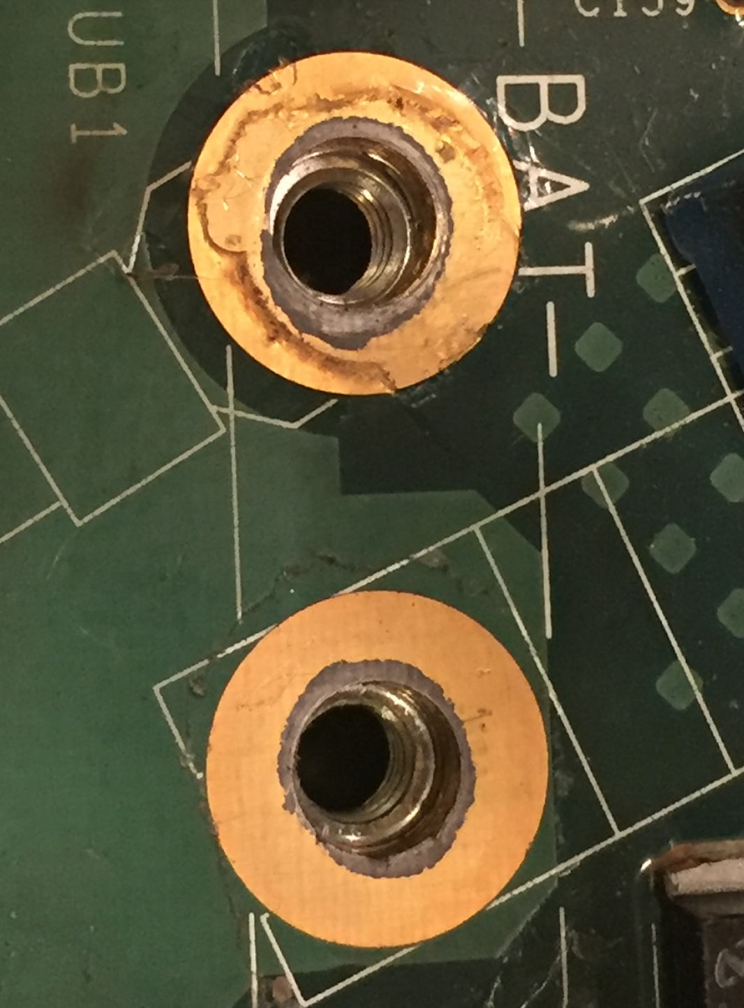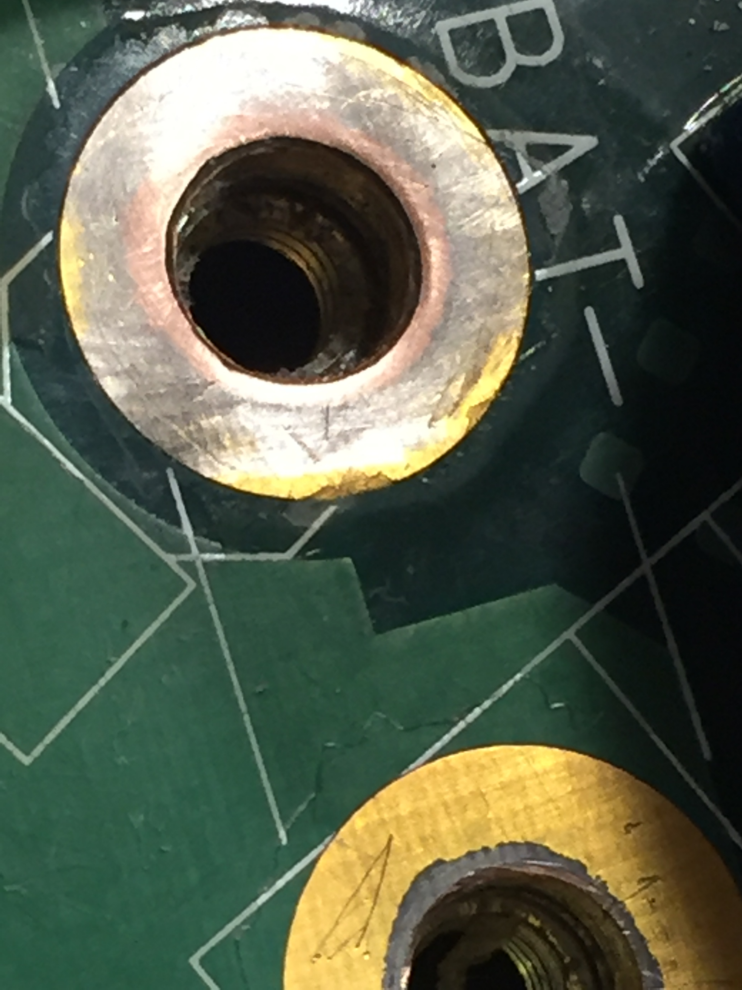 Vectrix hat unter die VBat Sechskant Terminals diese blödsinnigen geschlitzen Unterlegscheiben verbaut. Leider haben die sich in die weiche Platine eingearbeitet und dabei das Kupfer zerstört. So wie es aussieht ist das nur eine doppelseitige Platine. Das Plus-Terminal hat auf der Oberseite keine Verbindung und die Durchführung scheint hauchdünn ausgeführt. - Was zur Stromführung bleibt, ist die M5 Schraube, bzw. das Gewinde des Stahl Sechskants.