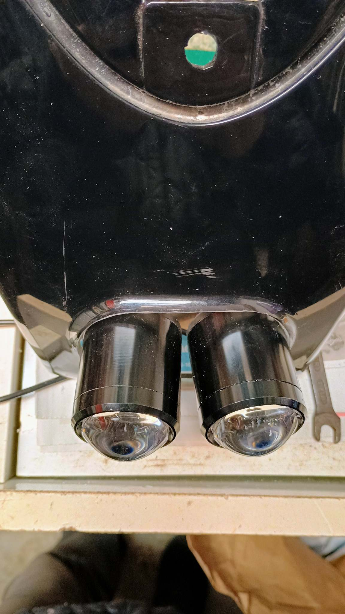 Jetzt wo alles grob passt könnte man da ein Inlet mit 3D drucken, aber ist halt schwierig mit dem Winkel, Hauptsache mehr Licht. Durch die leichte Wölbung der Verkleidung gehen die beiden Leuchtkegel etwas nach außen, wenn das doch im Alltag zu weit sein sollte, kann ich da mit einem Streifen aus Kunststoff noch die Richtung korrigieren.