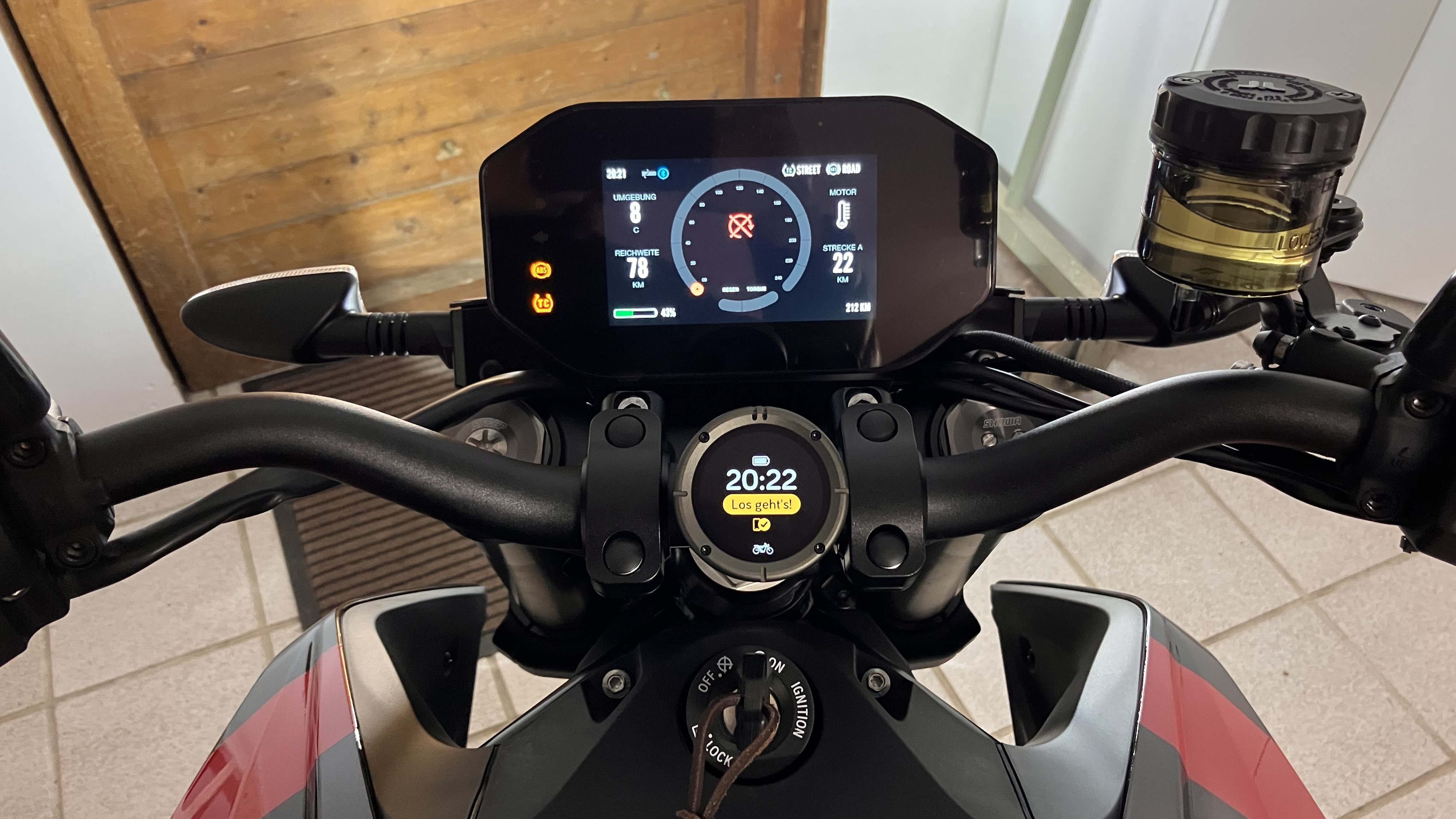 Der Lenker-Umbausatz von Voigt MT GmbH ist bereits drauf (20 mm nach hinten und 30mm nach oben meine ich) und macht sich gut. Kein Riesenunterschied, aber merklich besser, hab bei den aktuellen Temperaturen aber erst knapp 20 km testen können. ABE ist mit dabei gewesen.