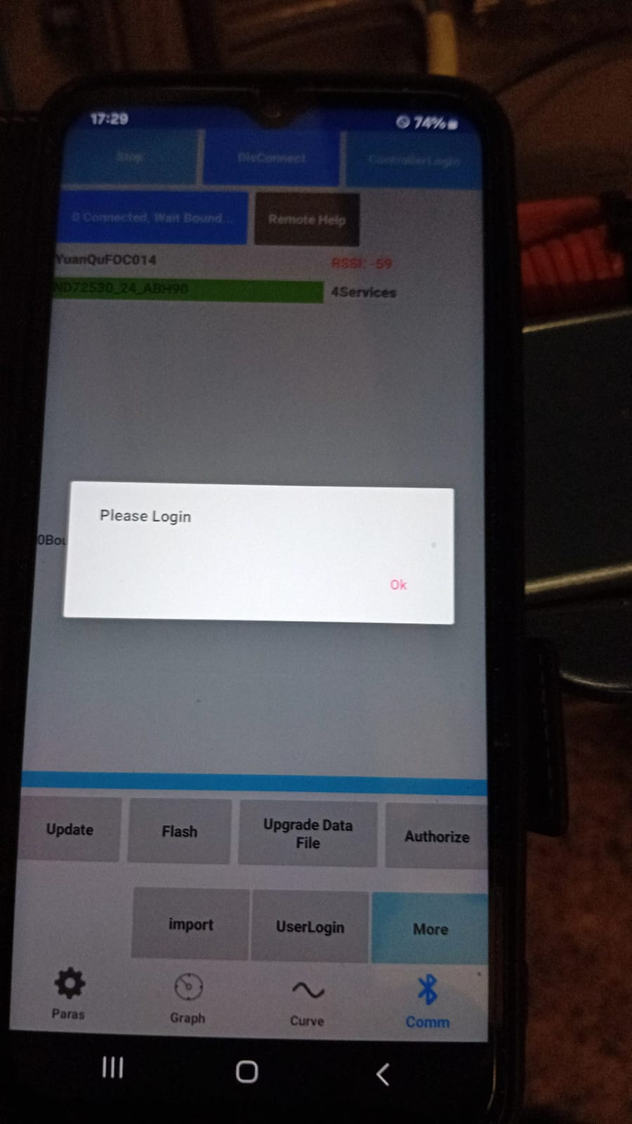 also heute morgen hab ich nochmal alles deinstalliert und neu gemacht. Und was soll ich sagen, es hat funktioniert. Ich hab sofort den Code bekommen. Natürlich bin ich sofort zu meinem TukTuk und hab es ausprobiert. Ja die App erkennt den controller und die Frames fangen an zu laufen. Aber oben links steht dann 0 connected, please login. Und es gibt ja zweimal login. einmal "User login" und oben rechts "controller login". aber woher bekomme ich oben rechts das Password? Ich hab ja alles korrekt verkabelt und die Kiste würde ja eigentlich laufen. Aber die Drehrichtung des Motors stimmt nicht.Er läuft rückwärts schnell und vorwärts langsam. Kann man die Drehrichtung irgendwie selbst verändern. Vielleicht durch Kabelumstecken oder so.