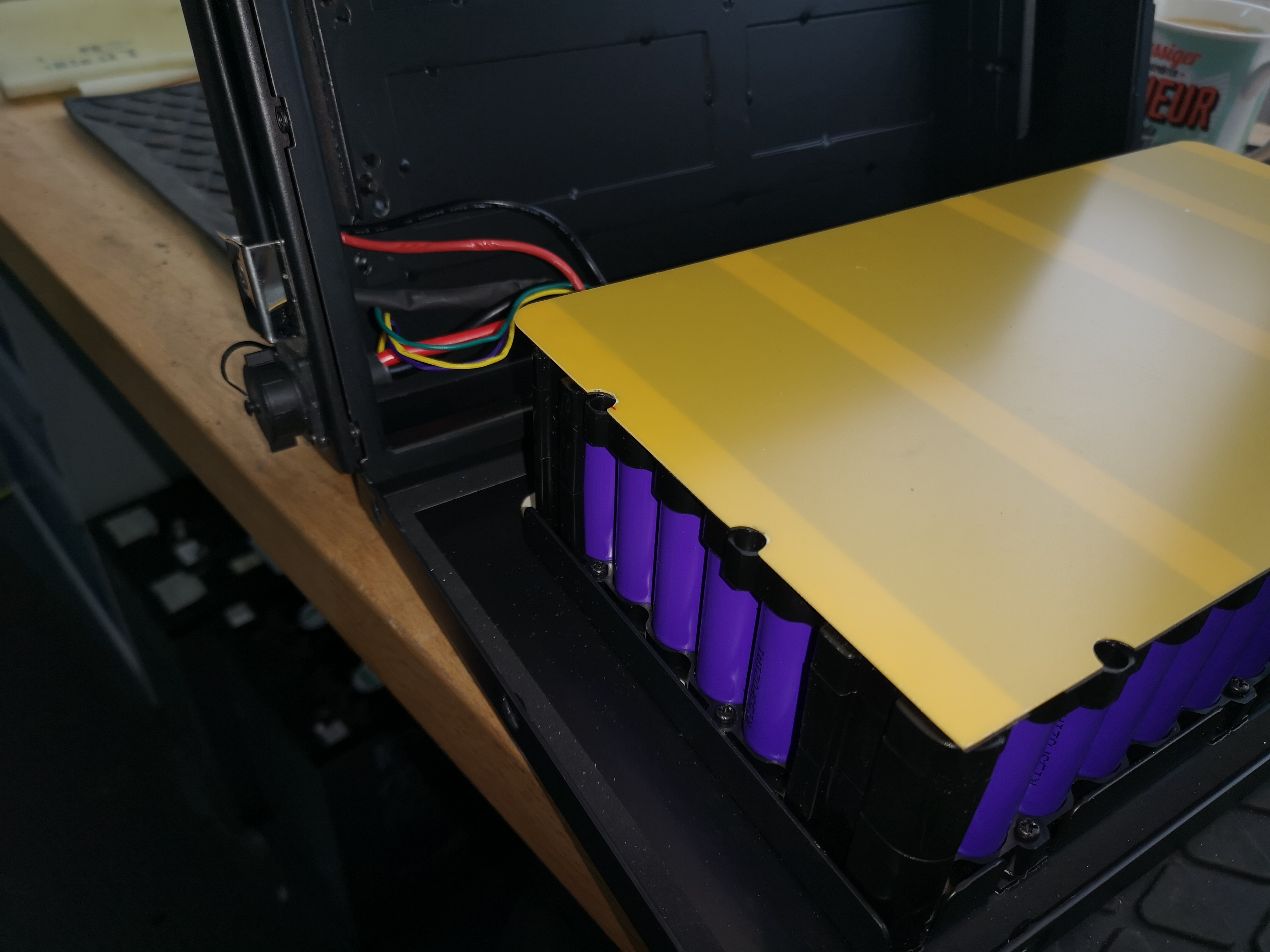 Im Explorer E-Cruzer sind Lithiumionen-Akkus mit 18650er Rundzellen mit 3,7V Nennspannung verbaut. Die 60V-Batterie hat 16 serielle und jeweils 8 parallele Zellen, ist also die kleinere Variante der 60Volt-Akkus (gegenüber 17s). Mit nominell 20 Ah kommt man normalerweise etwa 40-50km weit. Die Akkus und das BMS sind (neben dem schwachen Controller) das Nadelöhr. Die möglichen 3.000W des Boschmotors werden nicht annähernd ausgeschöpft.