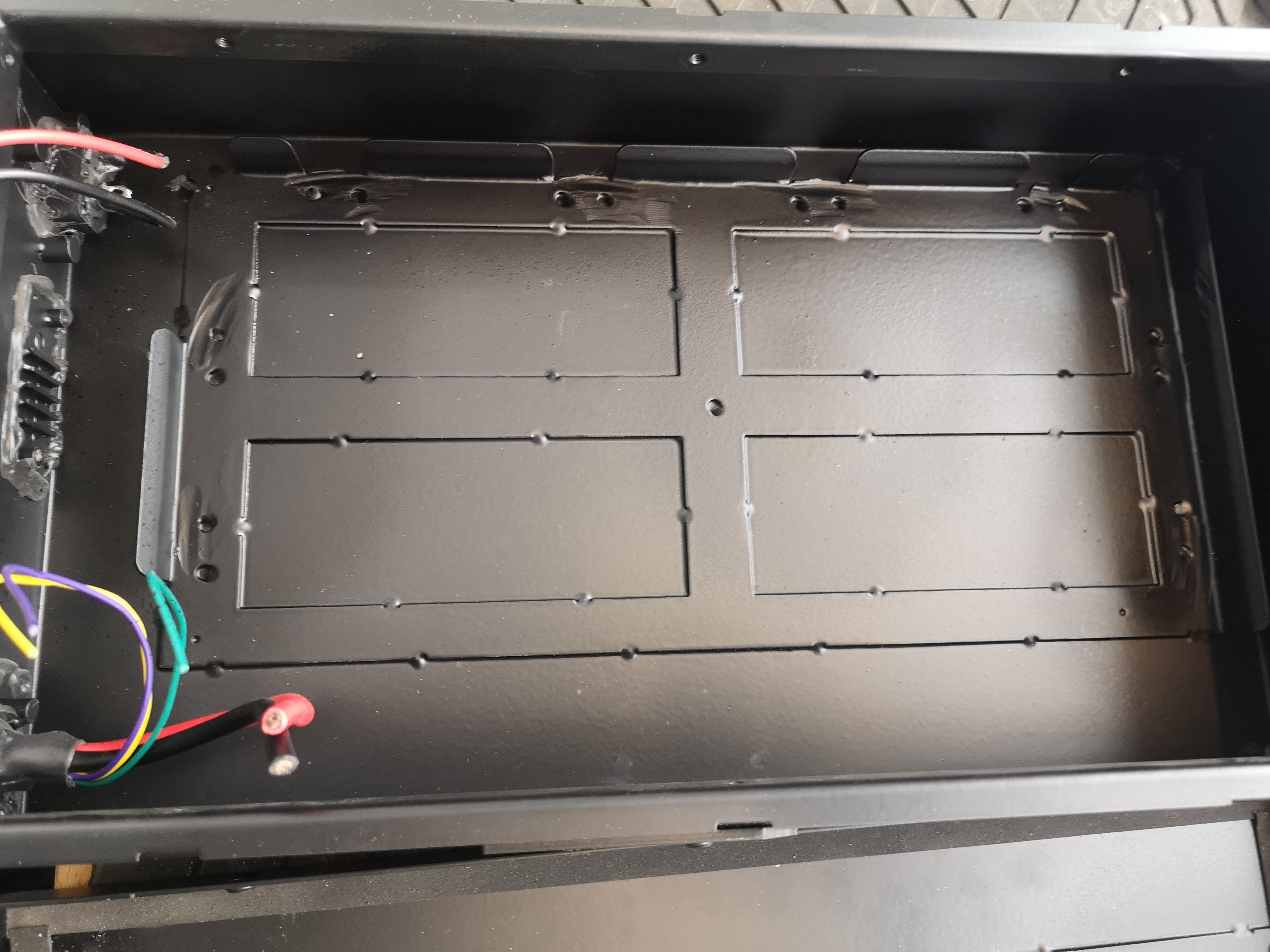 Im Gehäuse gibt es Führungen aus dünnem Blech. Die müssen z.T. weggeflext werden. Man kommt da mit dem Winkelschleifer grade so in die Ecken. Da darf nichts Scharfkantiges mehr stehen bleiben. Ich habe alles glatt geschliffen und mit der Spraydose übergespritzt. Die 17 Kabel zum BMS habe ich durchgeschnitten und mit dem Kabelsatz des Daly verlötet. Dafür habe ich vorher Schrumpfschläuche über die Kabel gezogen und damit die Lötstellen isoliert. Zum Löten braucht man eine Unterlage, um die Zellen nicht zu schädigen.