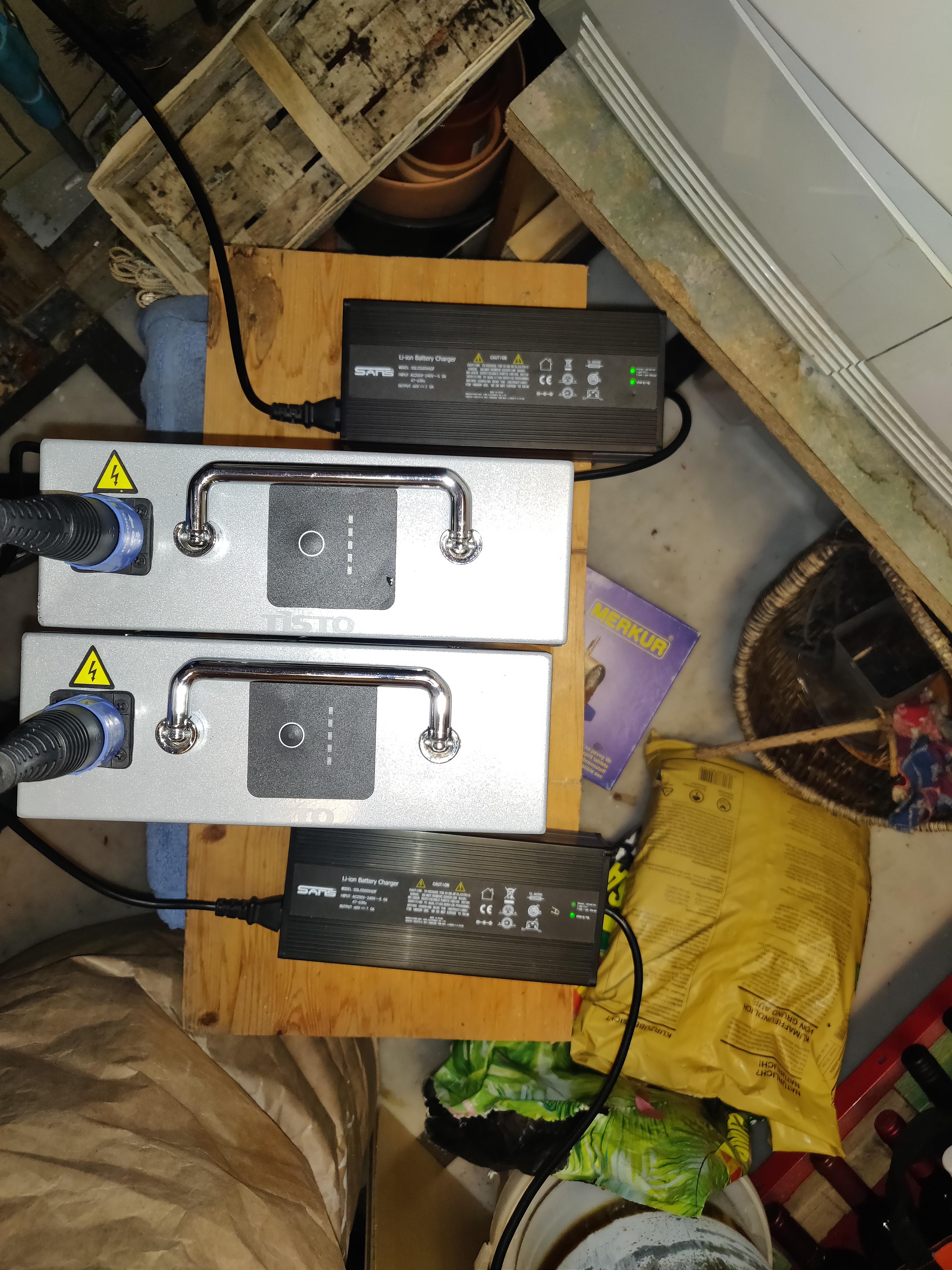 Nach dem ersten Laden mit den Originalladern: 0.01V Zelldifferenz. Der eine Akku zeigt 70,9V, der andere 71V nach Ende des Ladevorgangs.