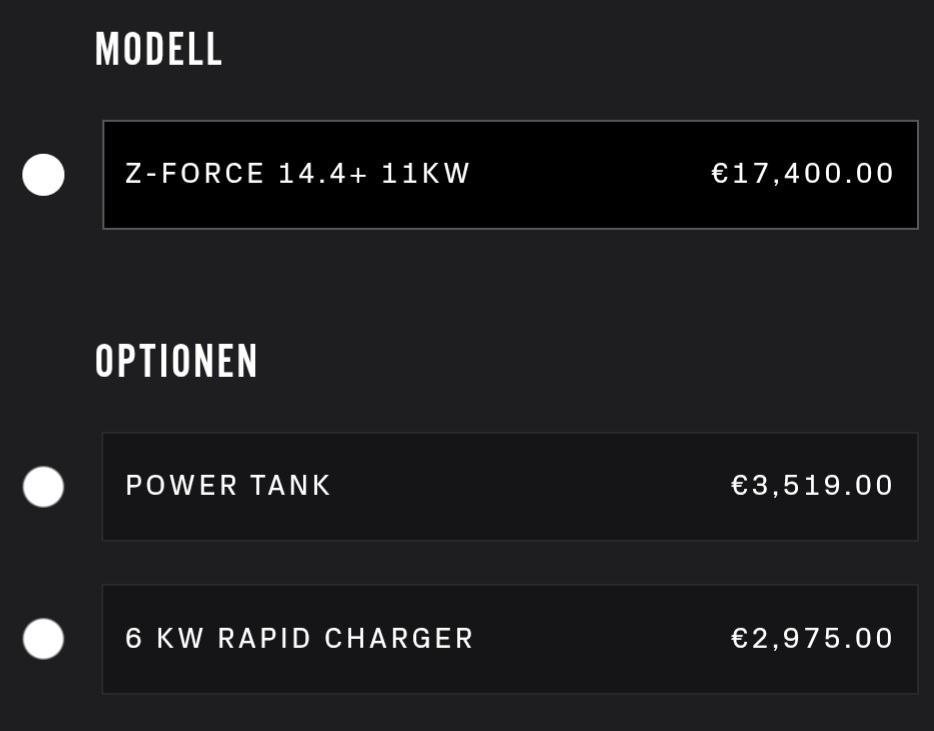 Bei der S kann man im Zeroshop entweder nur den Power Tank oder den 6 kW Rapid Charger dazukaufen.