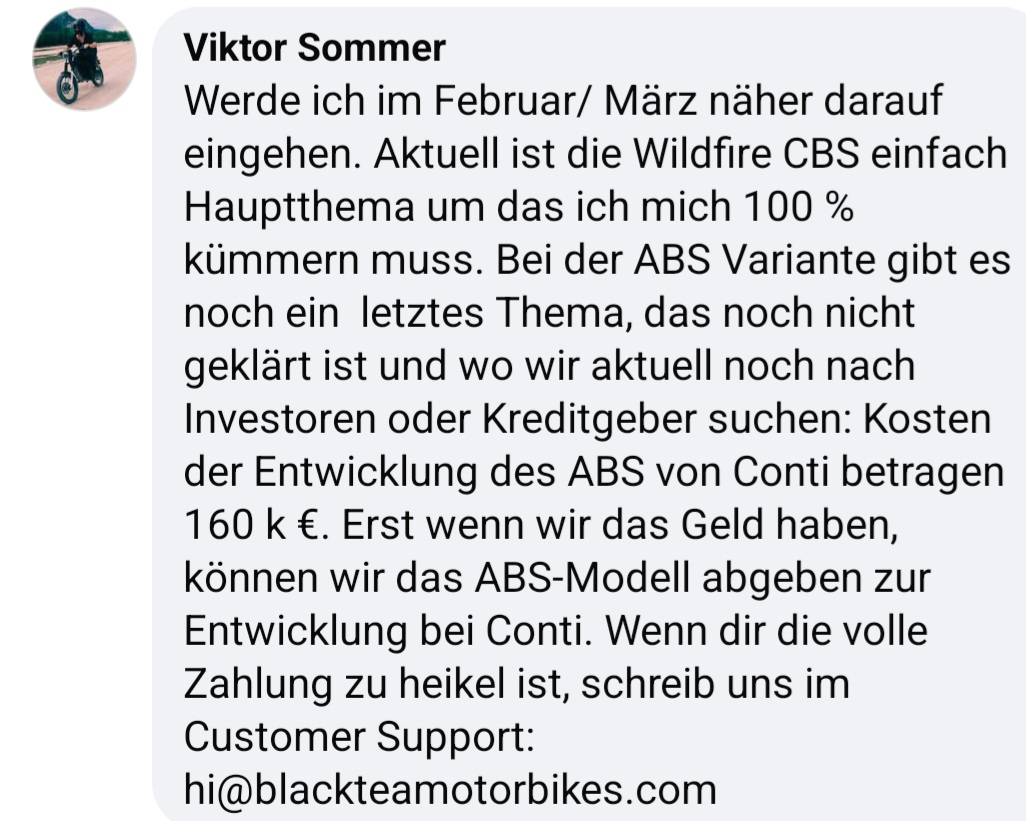 Folgendes aktuelles Update. Es lässt sich im Moment leider nur spekulieren, ob die Wildfirebestellungen mit ABS aus 2022-2024 auch bis Ende Mai geliefert werden, da das ABS laut Viktor ja erst noch finanziert und entwickelt werden muss (Die Info zum ABS ist allerdings schon vom 06.01.25). Würde mir hierzu gerne Infos wünschen.