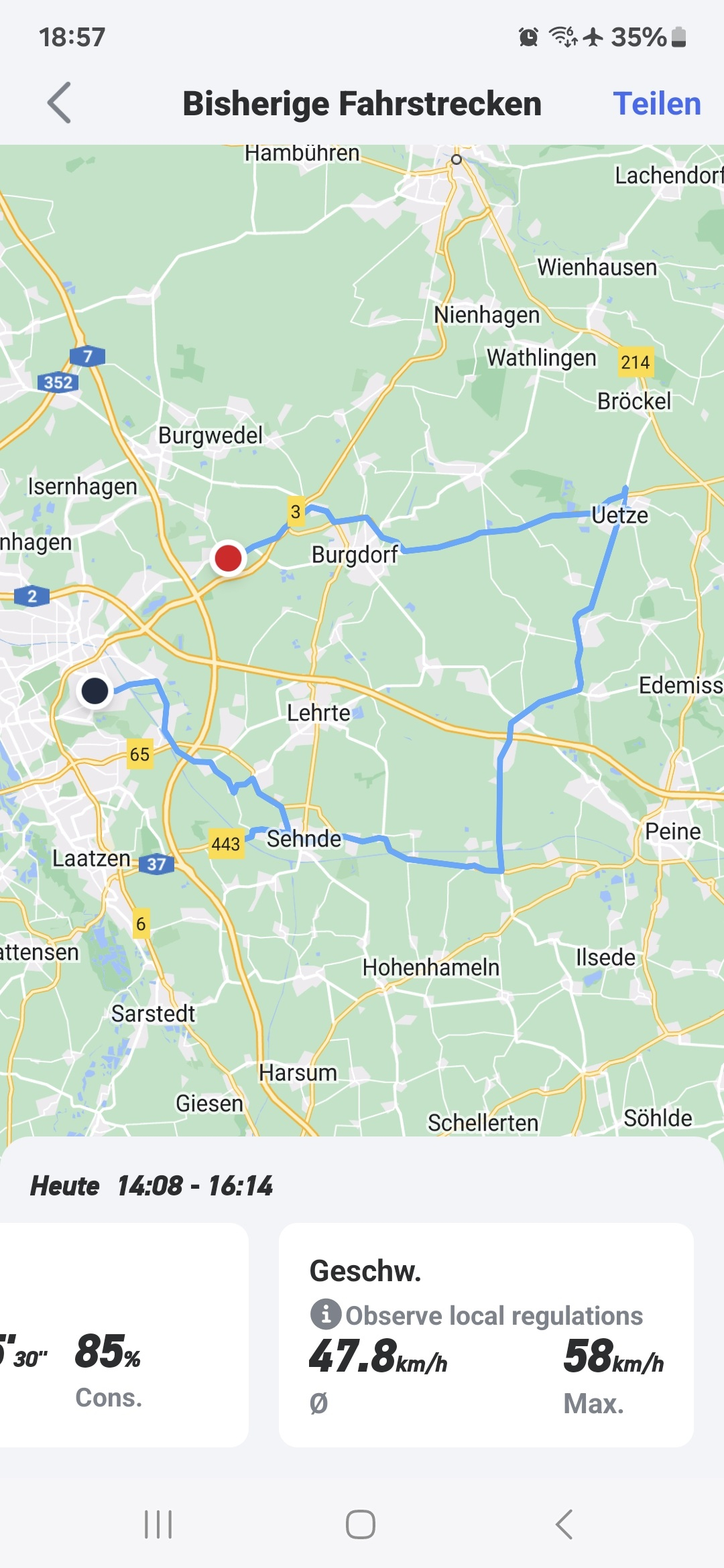 heute war das Wetter gut und ich hatte Zeit. Also mal den NIU raus und ne Reichweiten fahrt gemacht. Es ging mit Vollgas ( 54 km/h ) durch die Stadt ( ca. 10 % ) und den Rest über Landstraße und durch Dörfer. Zu 95 % mit Tempomat gefahren. Wind 17 km/h aus N-O Temperatur 8°.