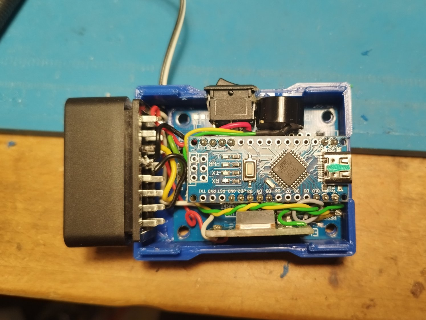 In das "Nobelhobel-Modul" habe ich einen Schalter (dient zum Trennen der Stromversorgung vom OBD-Port beim Nutzen der USB-Schnittstelle vom Handy aus, weil sonst der Linearregler auf dem Arduino das Handy mit Ladestrom versorgt und binnen Sekunden zerstört wird - ich habe jedenfalls einen Arduino hierbei eingebüßt), einen kleinen Piezo-Piepser und das hier schon genannte Modul mit den 6 Lüsterklemmen, (welches ich allerdings von den Lüsterklemmen befreit und mit der Säge deutlich verkleinert habe) appliziert und die bekannte CAN_receive-Demo-Software ein wenig umgeschrieben, so dass das alles den kleinen programmierbaren Lautsprecher eben nicht im Rhythmus des Bllinksignals versorgt, sondern beim ersten Aufblinken ein- und beim 1,5-fachen einer Aus-Zeit wieder abschaltet. Funktioniert einwandfrei. Nach meinen Erkenntnissen entfallen auf die Blinkerintervalle jeweils 20+20 CAN-Nachrichten (die dauerhaft gesendet werden).