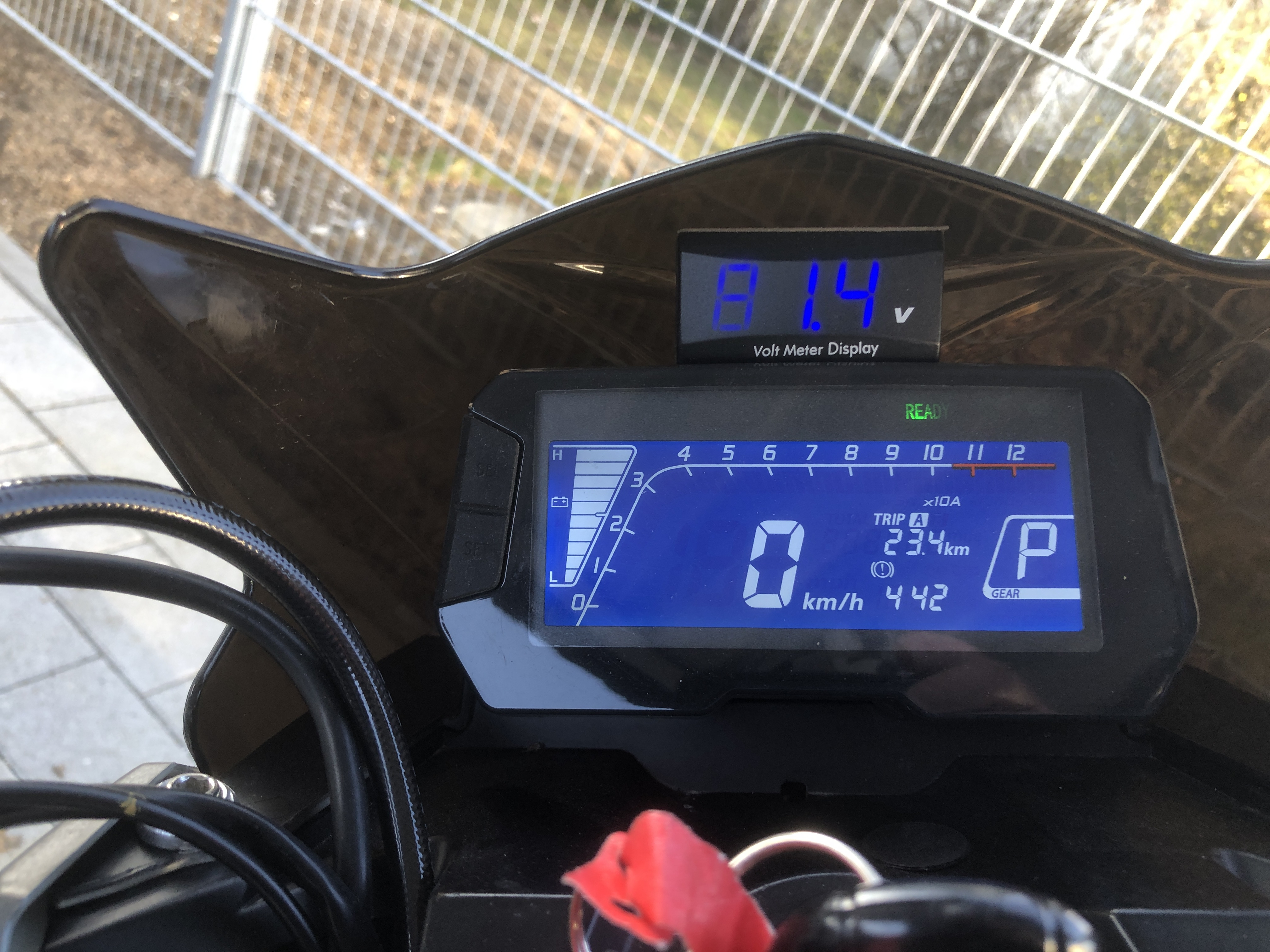 Diese Odin ist schon über ein Jahr alt und hat schon über 11000 km auf der Uhr. In meinem Bild sind nur Trip-Kilometer dargestellt, hatte keine Zeit, mit der Anzeige rumzuspielen. Vom R den schrägen Strich weggekratzt kann ich nicht ausschließen. Ich weiß nur, dass nach dem Schlüsseldreh, und ohne am Killswitch ausgeschaltet zu sein, die Fahrbereitschaft nur hergestellt werden konnte, wenn man mit gezogener linker Bremse die Wippe auf "P" gedrückt hatte. Dann Rechts auf S die Stufen von 1 bis 3 durchschalten.