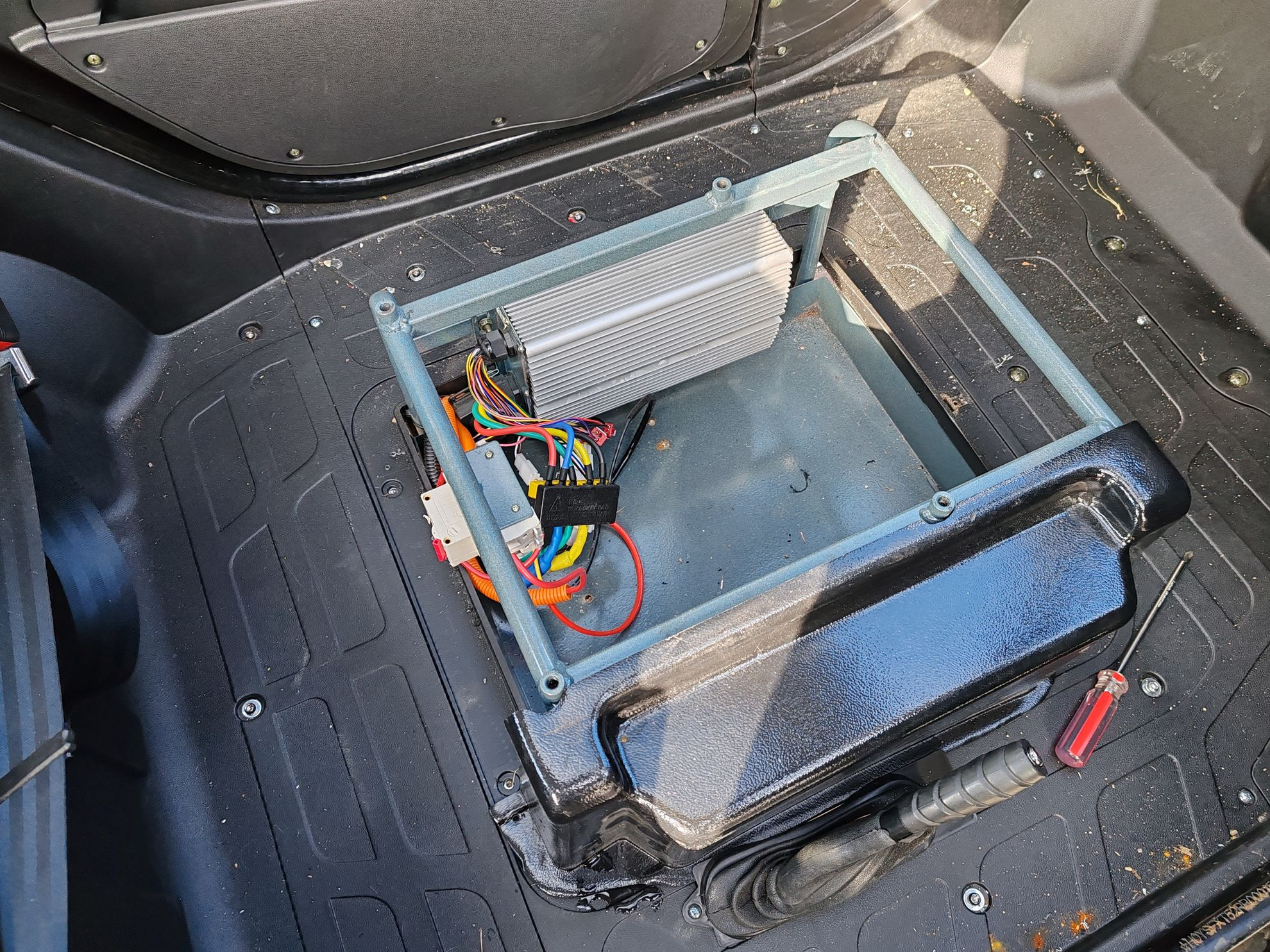 3. Die Plastik-Verkleidungsteile, außer dem Seitenteil-Handbremse, alle entfernen und man kommt an die Sicherung heran. Die ist von oben verschraubt. Auf die kleinen Muttern achten (von der alten Sicherung), bei meiner Ersatzsicherung waren keine dabei.