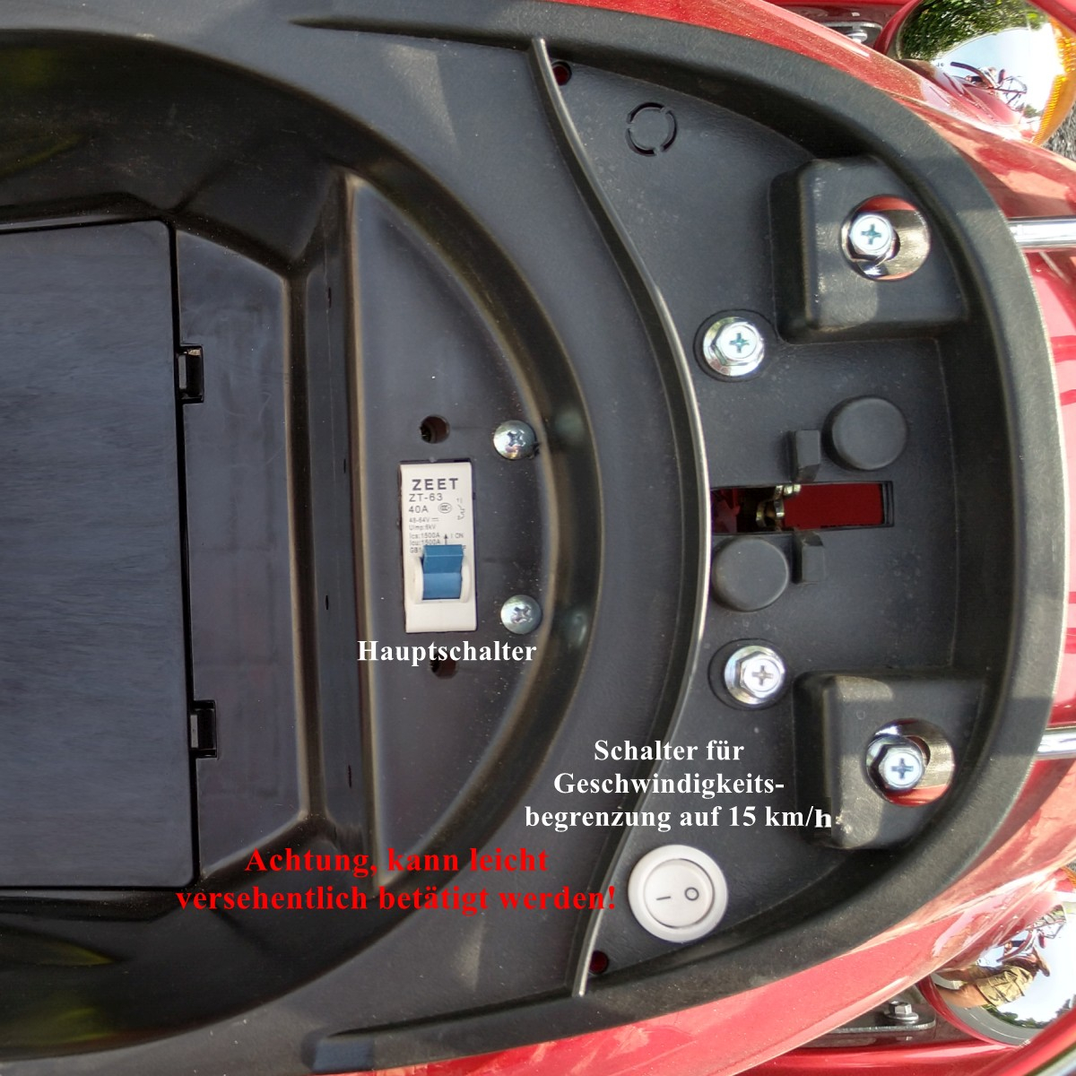 Bei meinem ZT63 (3 Stufen 8/16/25km/h) befindet sich unter dem Sozius ein Schalter zur Geschwindigkeitsbegrenzug auf 16km/h, empfehle dort mal nach zusehen!