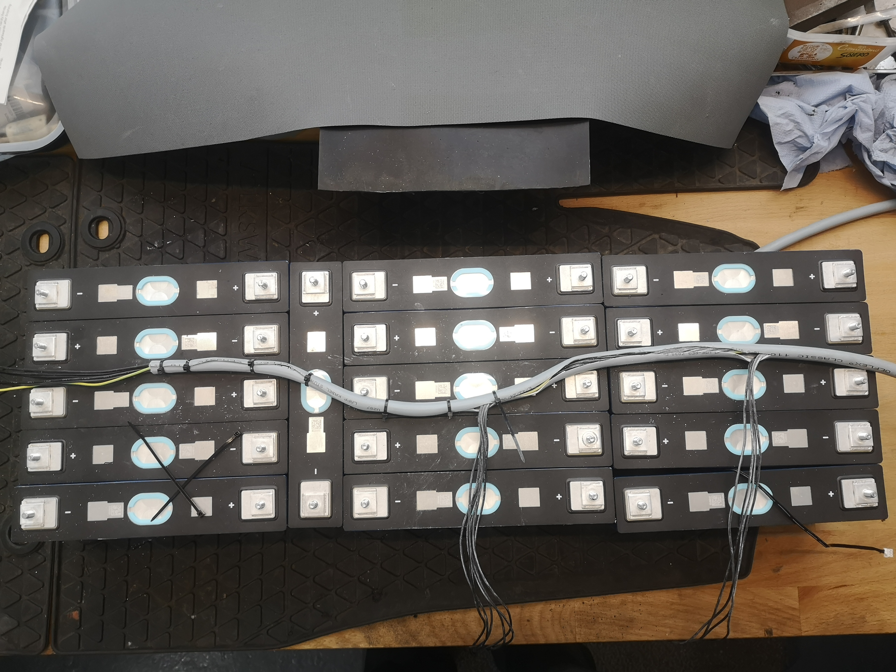 So, die ersten 1.000€ und gut 40kg sind verbaut. Die 175Ah-Zellen plus Isolator passen Millimeter-genau in das Akkufach, sodass ich auf ein zusätzliches Gehäuse verzichtet habe. Stabiler als der Vectrix-Rahmen wäre es sowieso nicht. Leider habe ich versäumt, Schlaufen unter einigen Zellen hindurch zu ziehen. Wenn die Zellen mal aufquellen, dürfte es mühselig werden, die wieder rauszuziehen.