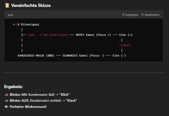 Nochmal zur Erinnerung, weil das hier durcheinander ging: Das Blinkersignal an die Leuchten links/rechts ist Gleichspannung 12V, das Signal zum Piezo hingegen 5V in Tonfrequenz, der originale Piezo ist passiv.