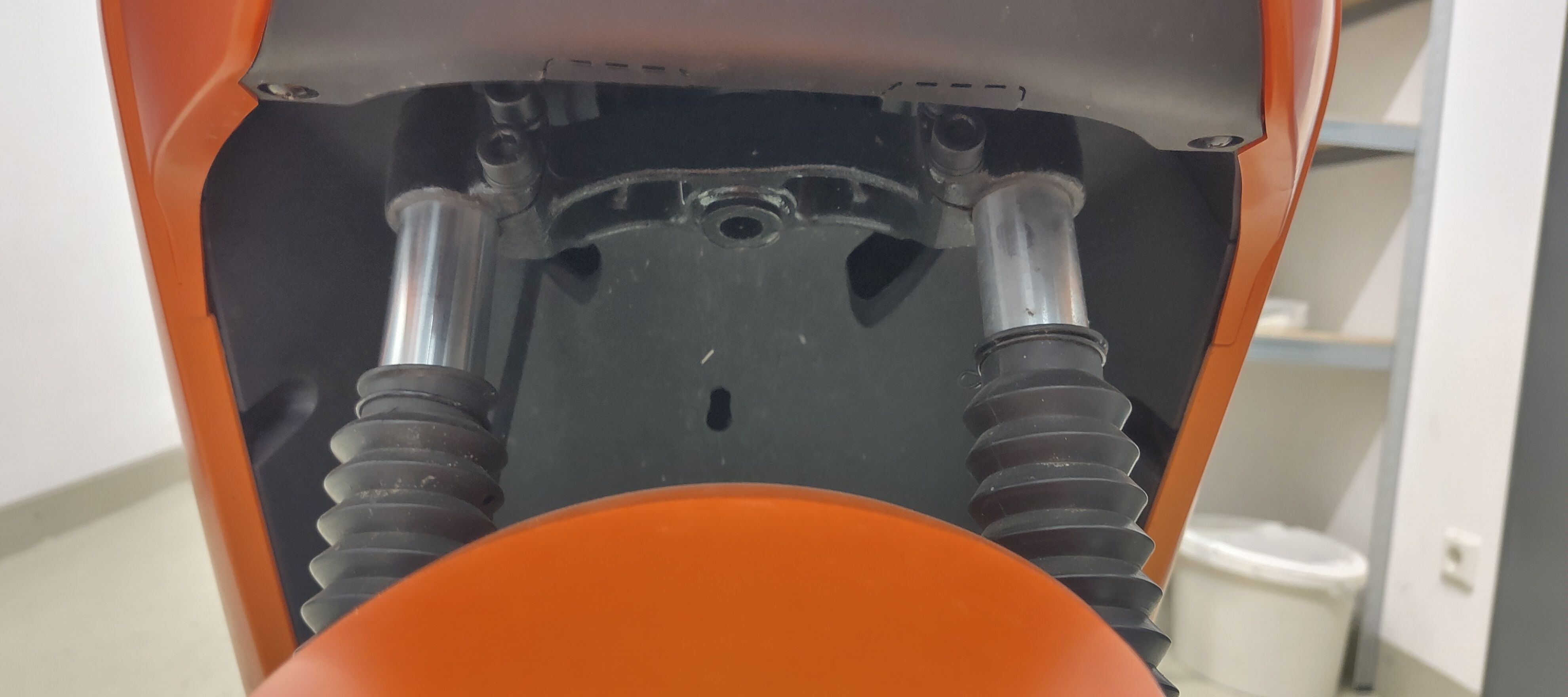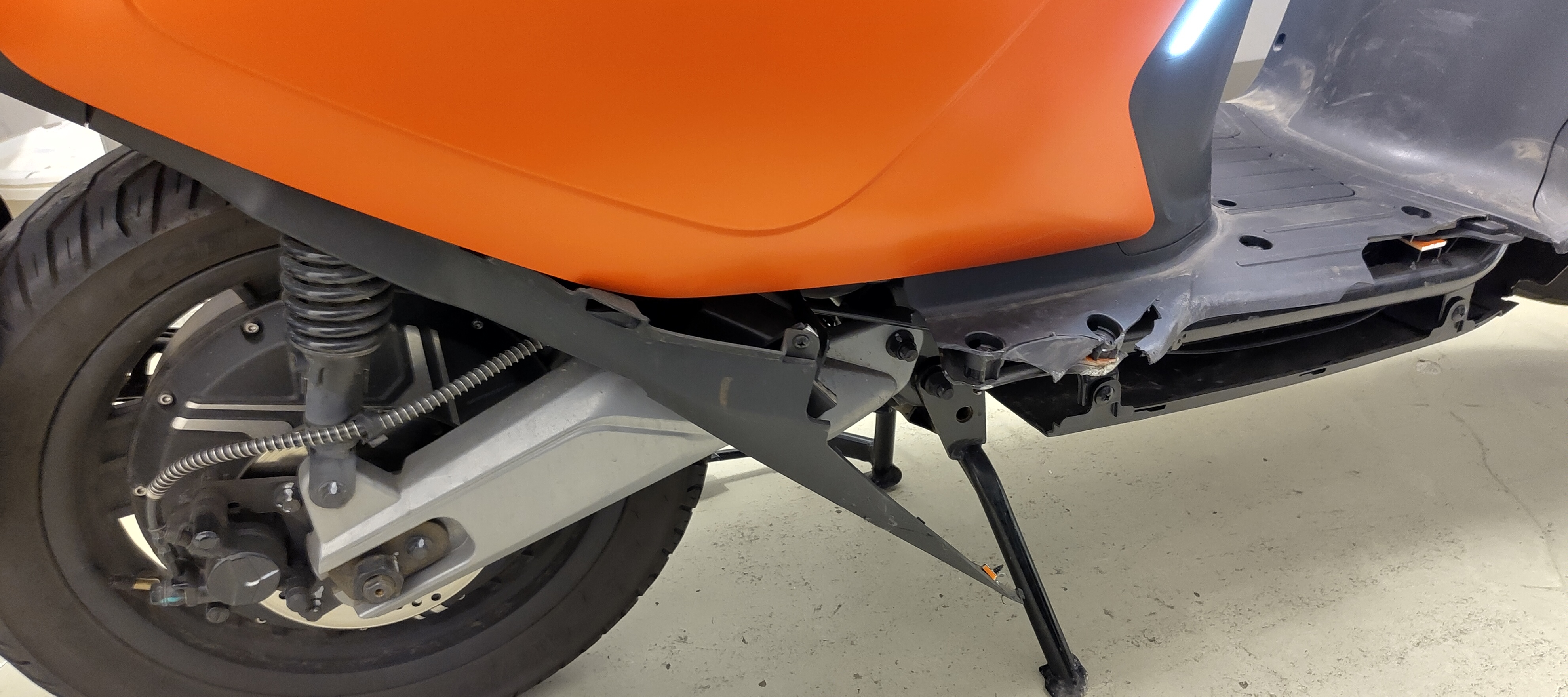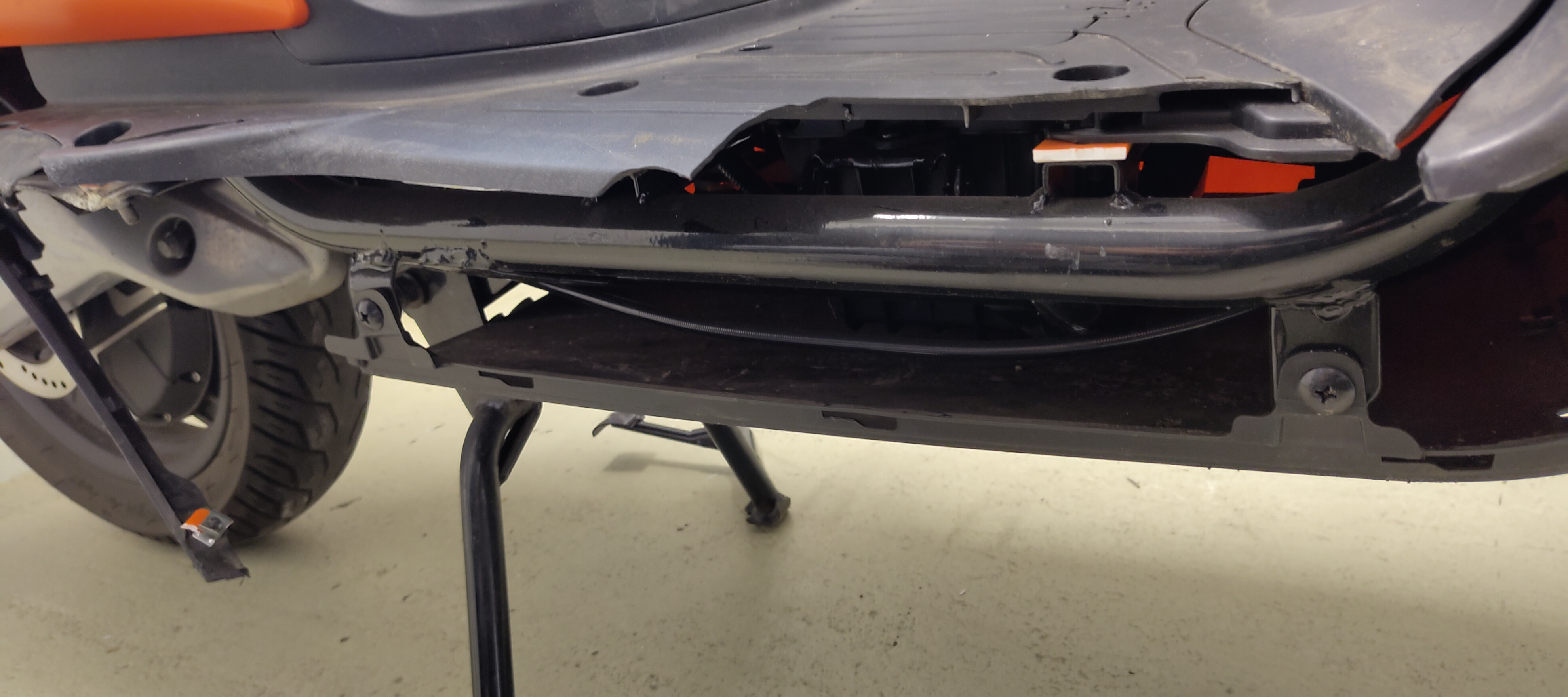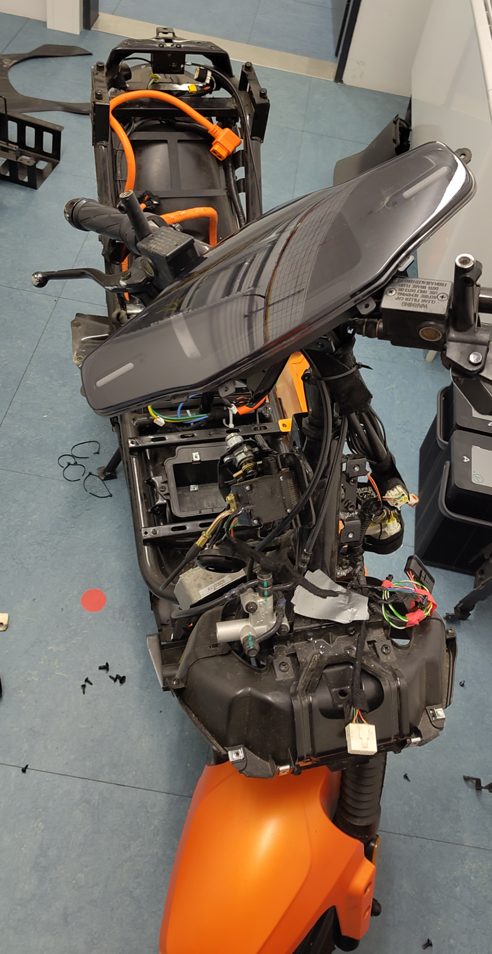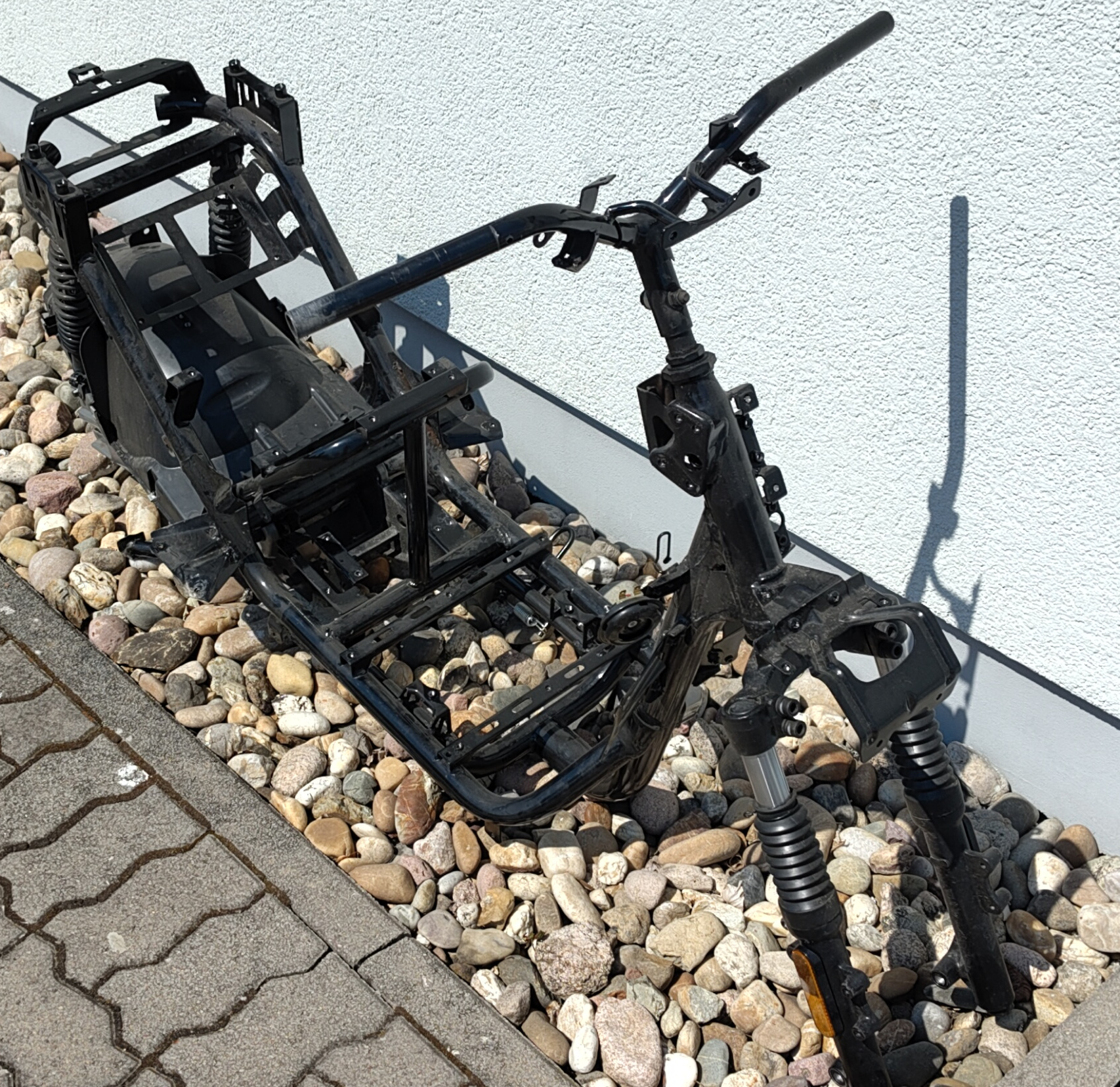 Das Lenker ist verdreht und ggf. die Gabel verzogen, kann aber optische Täuschung sein da die Verkleidung ziemlich gelitten hat. Der Rahmen sieht soweit gut aus. Die Elektronik ist scheinbar heile geblieben, Motor dreht ohne Fehlermeldung.
