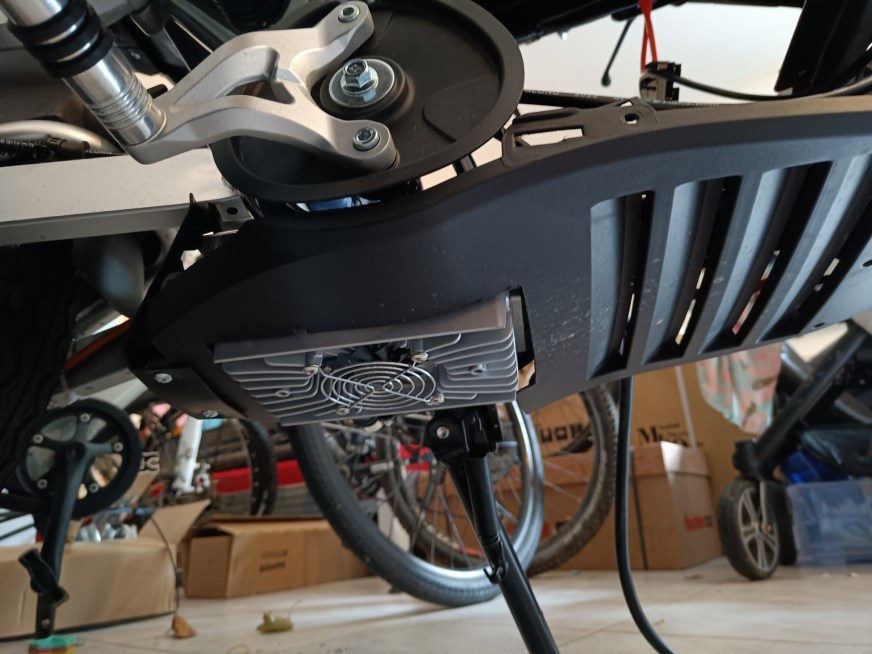 Eigentlich hatte ich geplant einen 30A Lader zu verbauen. Allerdings muss man schon sagen, dass in diesem Bike echt unglaublich wenig Platz vorhanden ist. Ich bin dann schweren Herzens auf einen 12A Lader zurückgegangen. Spätestens ab diesem Zeitpunkt ging es nur noch ums Prinzip :roll: Verbaut hab ich diesen dann im Unterboden in einem Ausschnitt, so dass dieser teilweise herausragt. Wie gesagt, unglaublich wenig Platz ist da vorhanden.