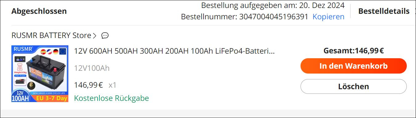 Ja einen 72V 30ah lifepo4 bei aliexpress. Müsste hier im Thread auch schon der link verfügbar sein. Sollte im Juni eintreffen.Kajago hat geschrieben: ↑Mo 31. Mär 2025, 19:43Hast du mittlerweile einen bestellt?dave0711 hat geschrieben: ↑Fr 7. Mär 2025, 09:39Guten Morgen allerseits,