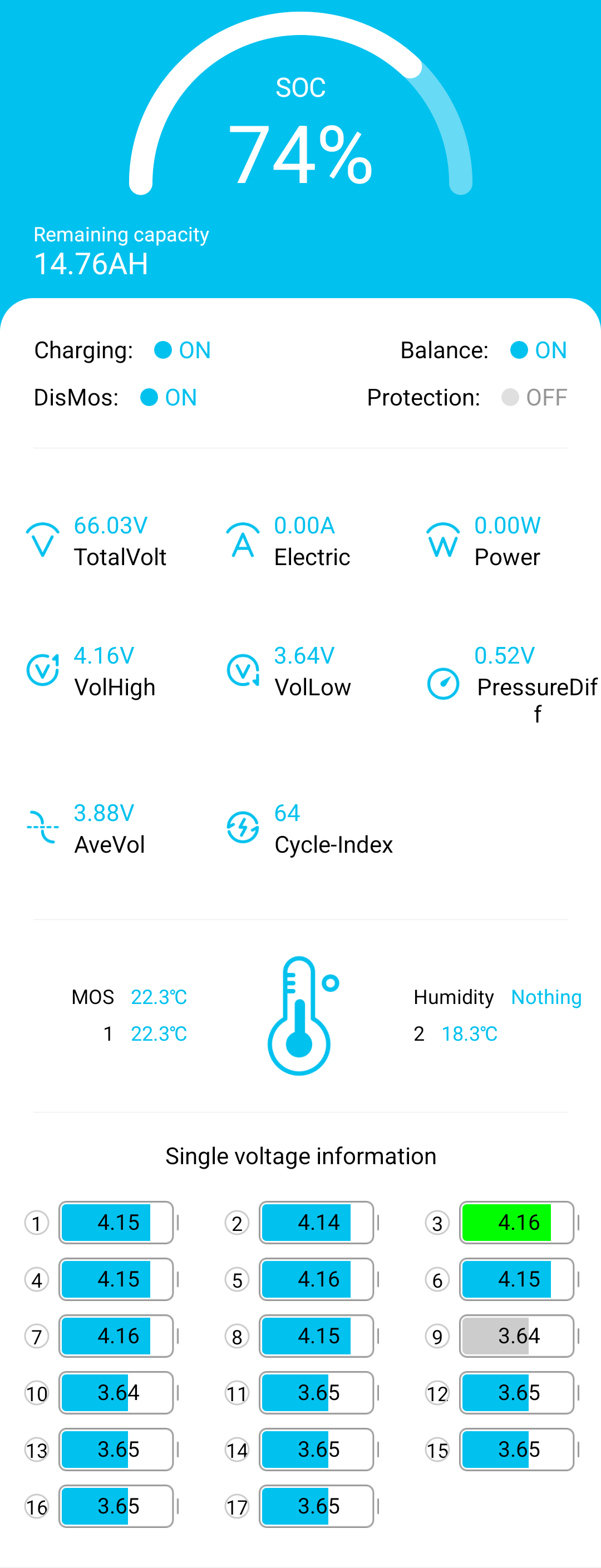 Alle Zellen ( bzw Stränge ) erst mal separat auf 4 V bringen. Sehr vorteilhaft dann mit geringerer Stromstärke ( kann an im original LG zb auf 2 A ) einstellen und in der App wie hier bei mir die Werte ändern.DirkNowe41 hat geschrieben: ↑Mo 21. Apr 2025, 10:27. Das Ladegerät bricht den Ladevorgang ab, sobald sich eine Zelle von oben 4,3V nähert, während sich die unteren noch bei ca. 3,7V befinden. Ich habe jetzt in den Einstellungen auf statisches Balancieren umgestellt und die Schwelle, bei der noch balanciert wird von 4000mV auf 3400mV herabgesetzt. Ist das BMS überhaupt in der Lage einen solch großen Potenzialunterschied von oben nach unten zu balancieren, oder muss man womöglich Zellen von oben einzeln entladen bzw. von unten einzeln nachladen? Falls ja, wie stellt man das am geschicktesten an, ohne die verklebten Zellen voneinander zu trennen?