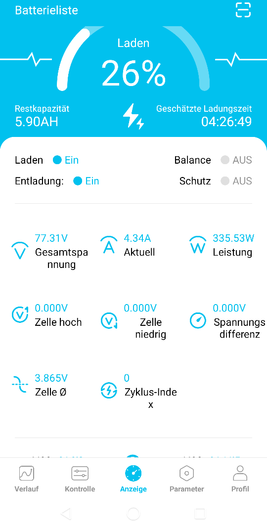 Wenn der Akku voll ist, sollte doch auf der Grafik bei "Restkapazität" auch die volle Kapazität stehen - oder? So ist es jedenfalls bei meinen anderen JBD BMS, die jedoch eine andere App (mit der bunten Grafik) haben.