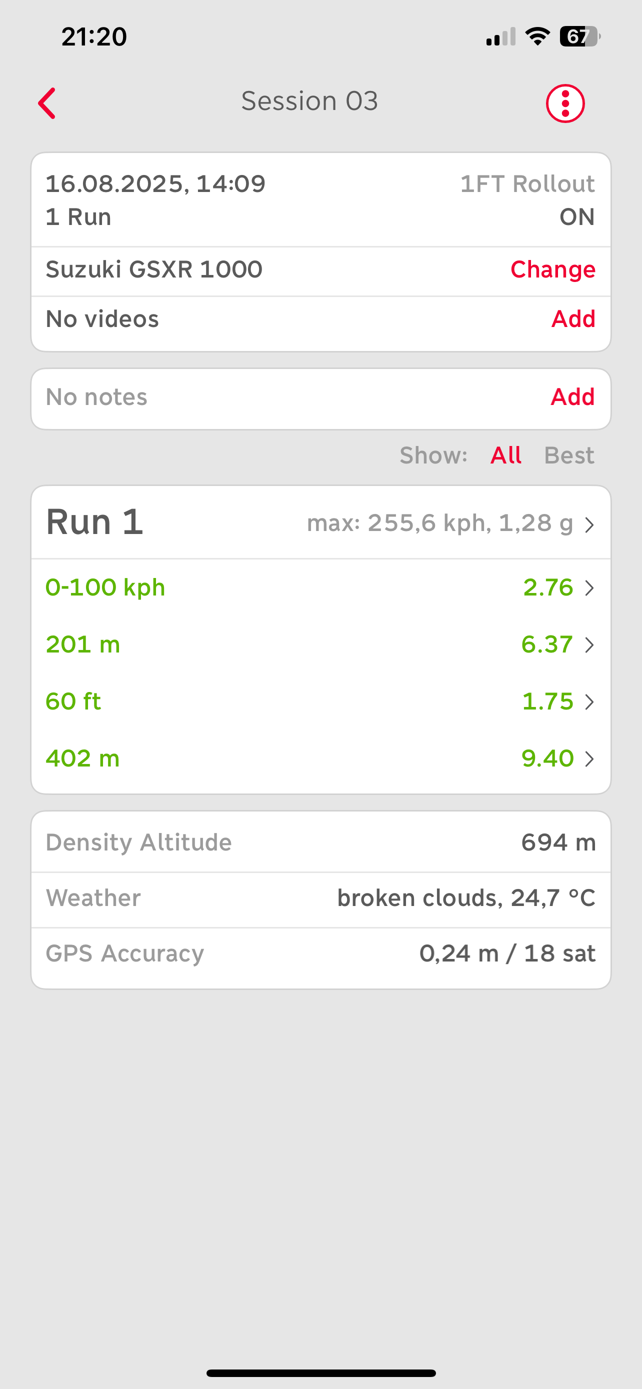 Hatte bei meinem besten Lauf allerdings mal wieder eine Reglerabschaltung direkt nach der 1/8 Meile und bin trotzdem noch in den hohen 9 Sekunden gelandet.