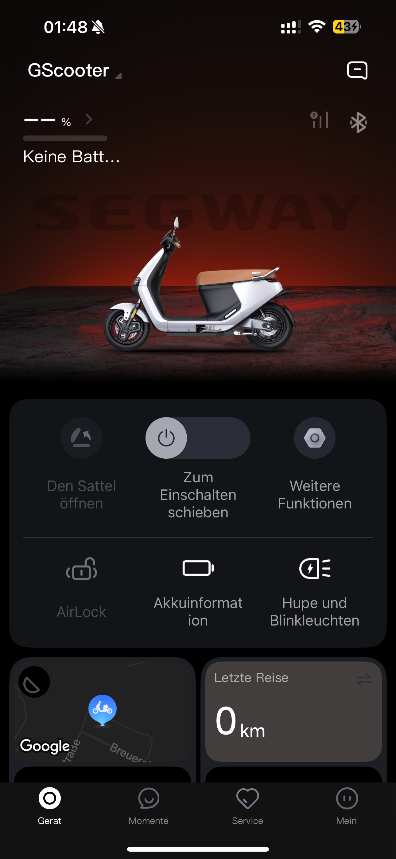Ich habe den Roller vor drei Tagen gebraucht gekauft und kenne mich noch nicht so gut aus. Ich habe bereits einige Reset-Methoden ausprobiert (Akku abklemmen, grüne Taste 8 Sekunden gedrückt halten etc.), aber leider ohne Erfolg – kein GSM-Signal, Symbol bleibt grau.