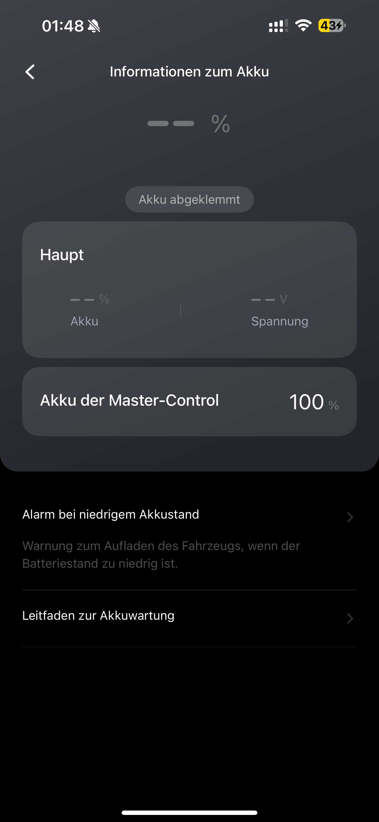 Zudem ist die Uhrzeit im Display falsch (3 Stunden vorgedreht), und in der App wird mir nur ein Akku angezeigt. Es heißt, der Hauptakku sei nicht angeschlossen. Funktionen wie “Hupen und Blinken” funktionieren nicht, da ebenfalls “Hauptakku getrennt” angezeigt wird. Ich habe die Akkus abgeklemmt, getauscht, die Plätze gewechselt – alles ohne Erfolg.