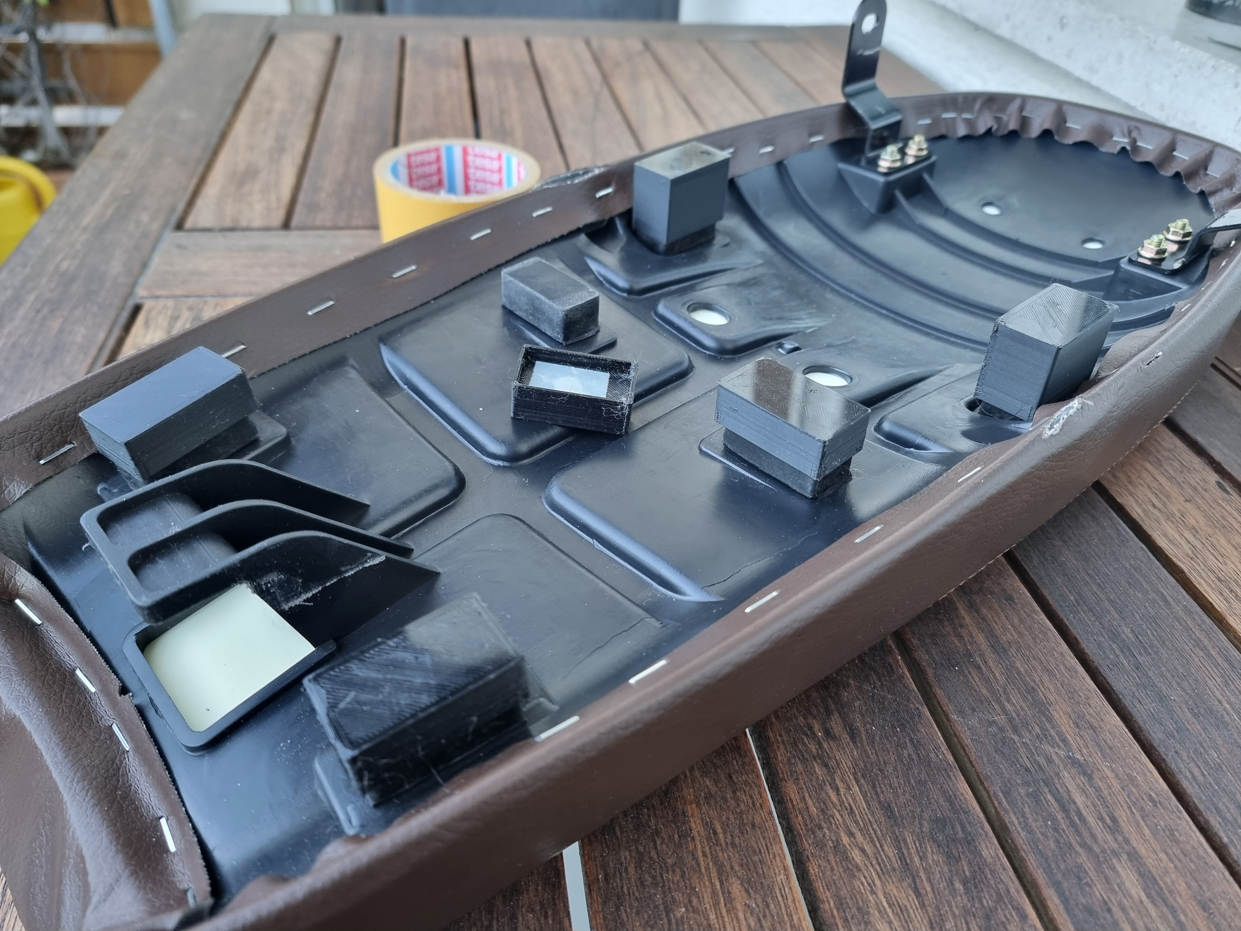 Bisher habe ich D-Ringe an Lederschlaufen mit den Schrauben angebracht, die den Sitz befestigen. Zum Einhängen von Gurten oder einem Expander, um eine Tasche auf dem Sitz zu befestigen. (Sorry, nicht aus dem 3D-Drucker – hoffe, das ist trotzdem nicht allzu fehl am Platz hier