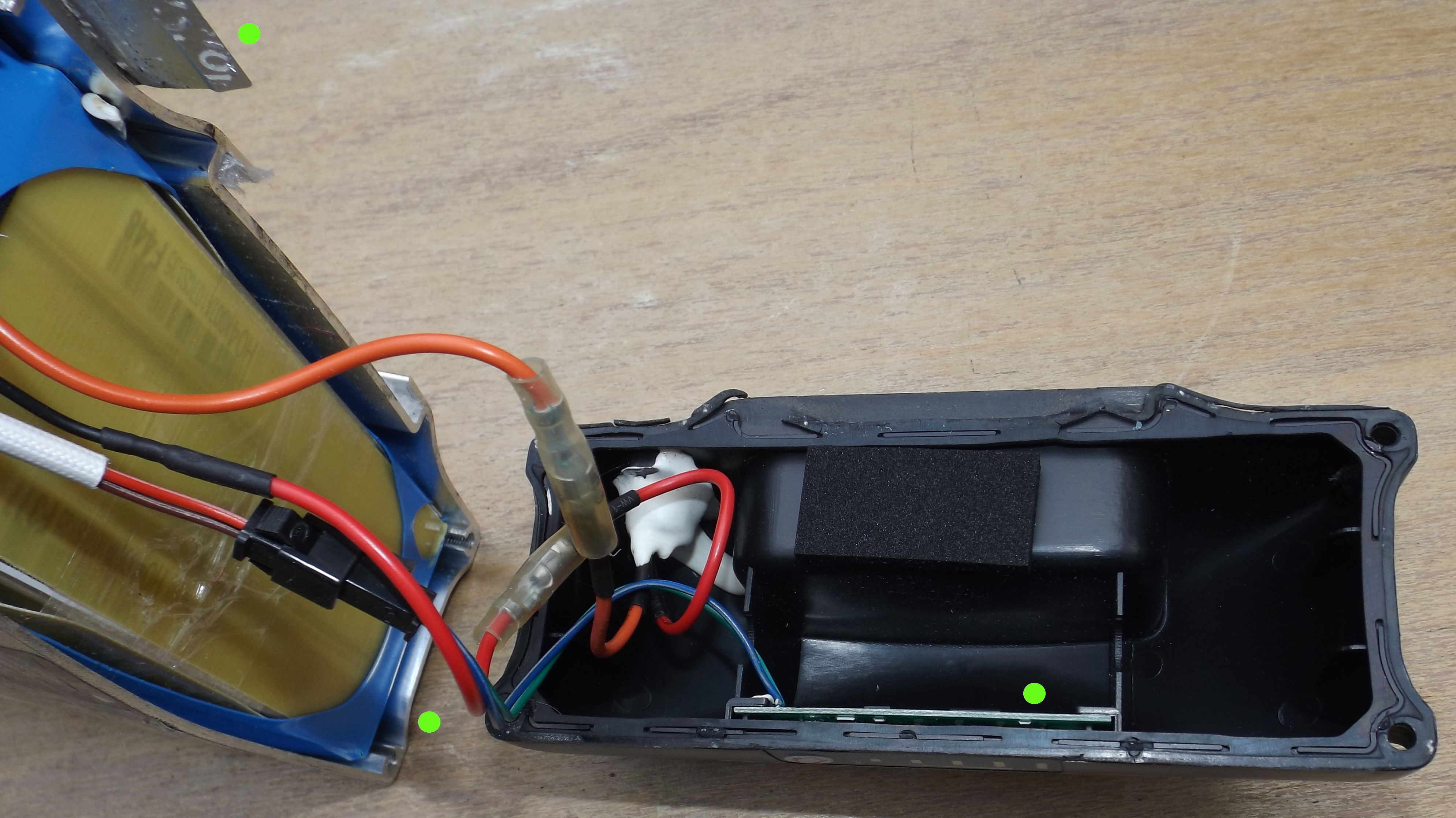 Um aber an das BMS heranzukommen, muß man vorher die beiden schwarzen Blöcke heraus haben. Weil ich nicht wußte, was für eine Elektronik in den schwarzen Dingern ist, war das ein kalkuliertes Risiko. Außerdem: der Akku war sowieso hinüber. Also mit einem Schraubenzieher so lange seitlich drücken, bis der erste schwarzen Klotz aufgibt. Dann noch den zweiten mit der Pertinax-Platine ... und dann sieht es so aus: