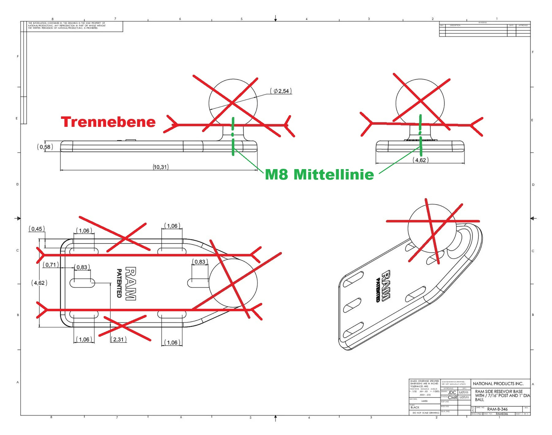 Verbaut sind 2x "Ram Mounts" Basisplatten für Brems- und Kupplungsflüssigkeit, Kugel abgetrennt, Bohrungen für M8 gebohrt, M8 geschnitten, Breite der Platten an die Breite der Naxeon Flüssigkeitsbehälter angepasst, auf die Plattenerhebungen (die mit den M8 Gewinden) 2 etwas größere & dickere Gummimuffen gegen Vibrationen aufgesteckt, Spiegel aufgesetzt, M8 Schrauben in die RAM Platten geschraubt, Spiegel justiert, fertig.