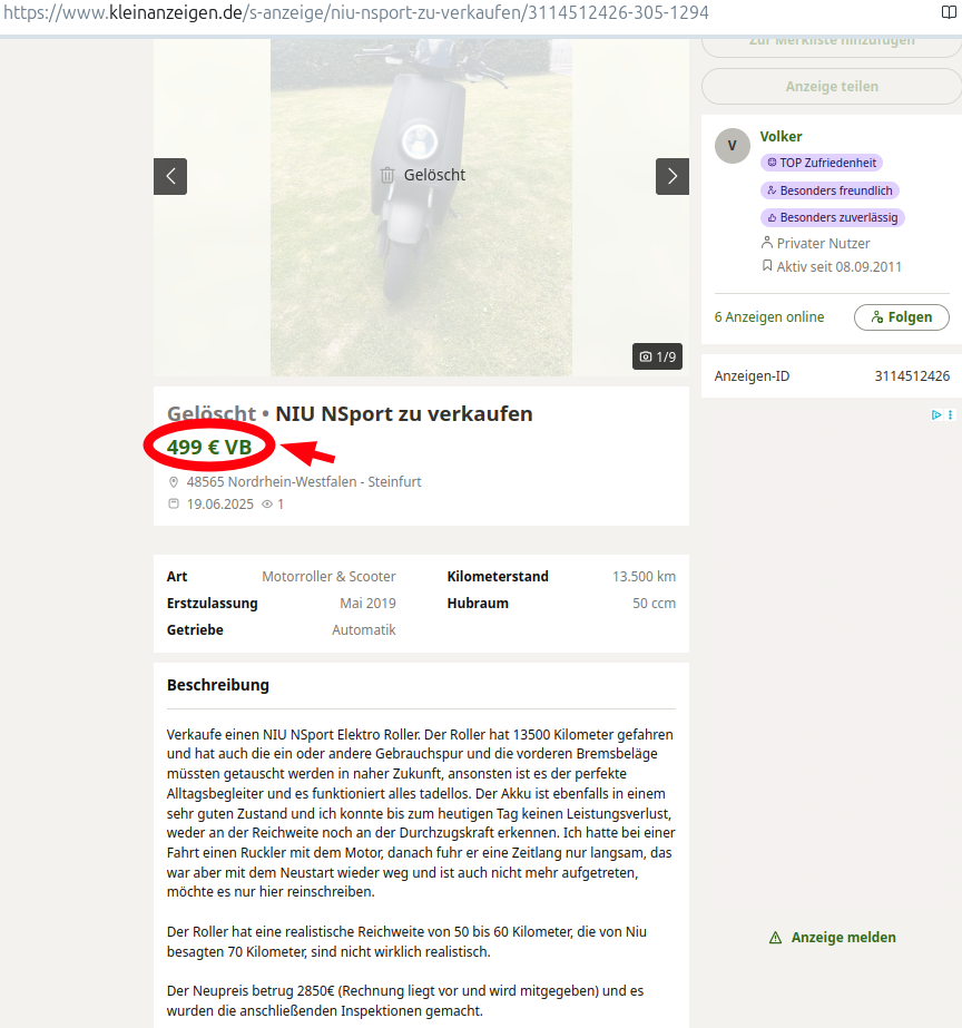 Wenn ihn der TE tatsächlich für 500 € erstanden hat, war es sicherlich ein guter Deal:Pakete207 hat geschrieben: ↑Sa 21. Jun 2025, 07:13Ich fange einen neuen Job in 13 km Entfernung an und dachte, dass ein Elektroroller dafür vielleicht perfekt wäre (also insgesamt 26 km pro Tag).