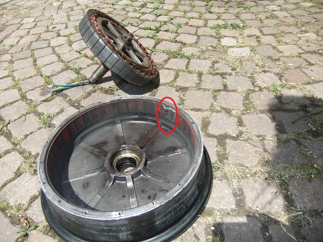 Der Motor hat nun Masseschluss. Ich möchte den retten und deshalb demontieren. Motor von Achse runter und Motordeckel öffnen ist schon geschehen. Jetzt geht es darum, den zweite Felgenteil/Motorseite von der Achse runter zu bekommen. Und genau da scheitere ich.