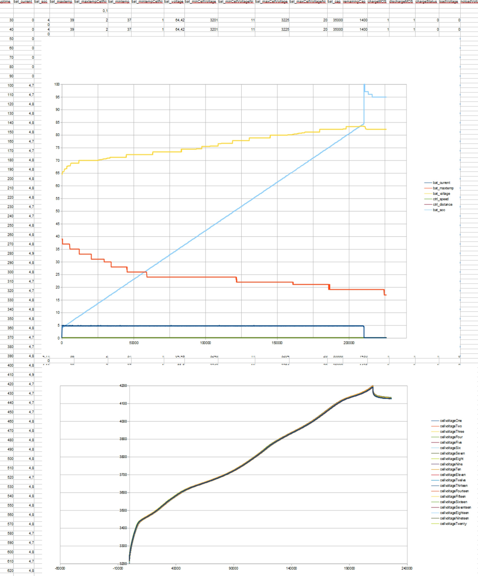 Ich habe mal noch die worst case Kurve vom problematischen 400W Ladegerät gefunden, welches ich mittlerweile nicht mehr verwende. Hier hat es die CV-Phase erst gar nicht erreicht und der SOC-Wert wurde recht stark einfach hochkorrigiert. Das habe ich dann bei der geringen Reichweite auch gespürt.