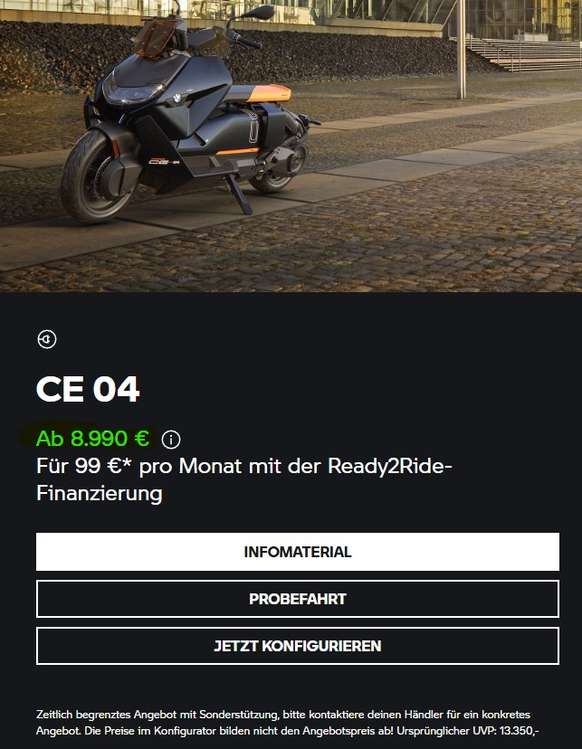 Das ist ev. der Grund für diese Rabattaktion von BMW-AT denn wäre jetzt sonst so bescheuert sich einen zu kaufen, wenn es demnächst 2300€ dazu gibt.rage hat geschrieben: ↑Di 1. Jul 2025, 19:46In AT bekommen E-Motorräder 2300 Euro Förderung. Siehe https://www.derstandard.at/story/300000 ... ef246rdert