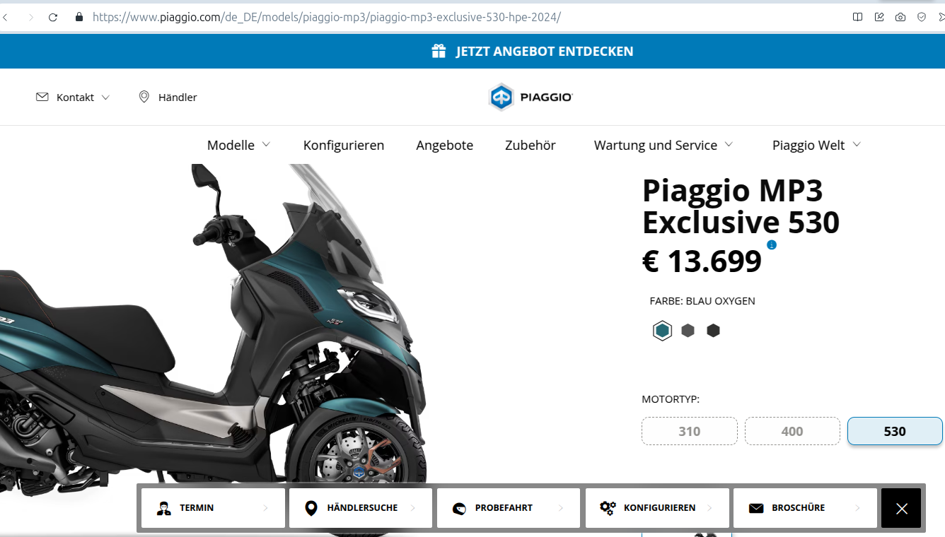 Trotzdem wäre es schön, wenn er etwas schneller wäre, weshalb ich auch ein wenig "Blut geleckt" habe und mit einer Piaggio MP3 530 liebäugle.