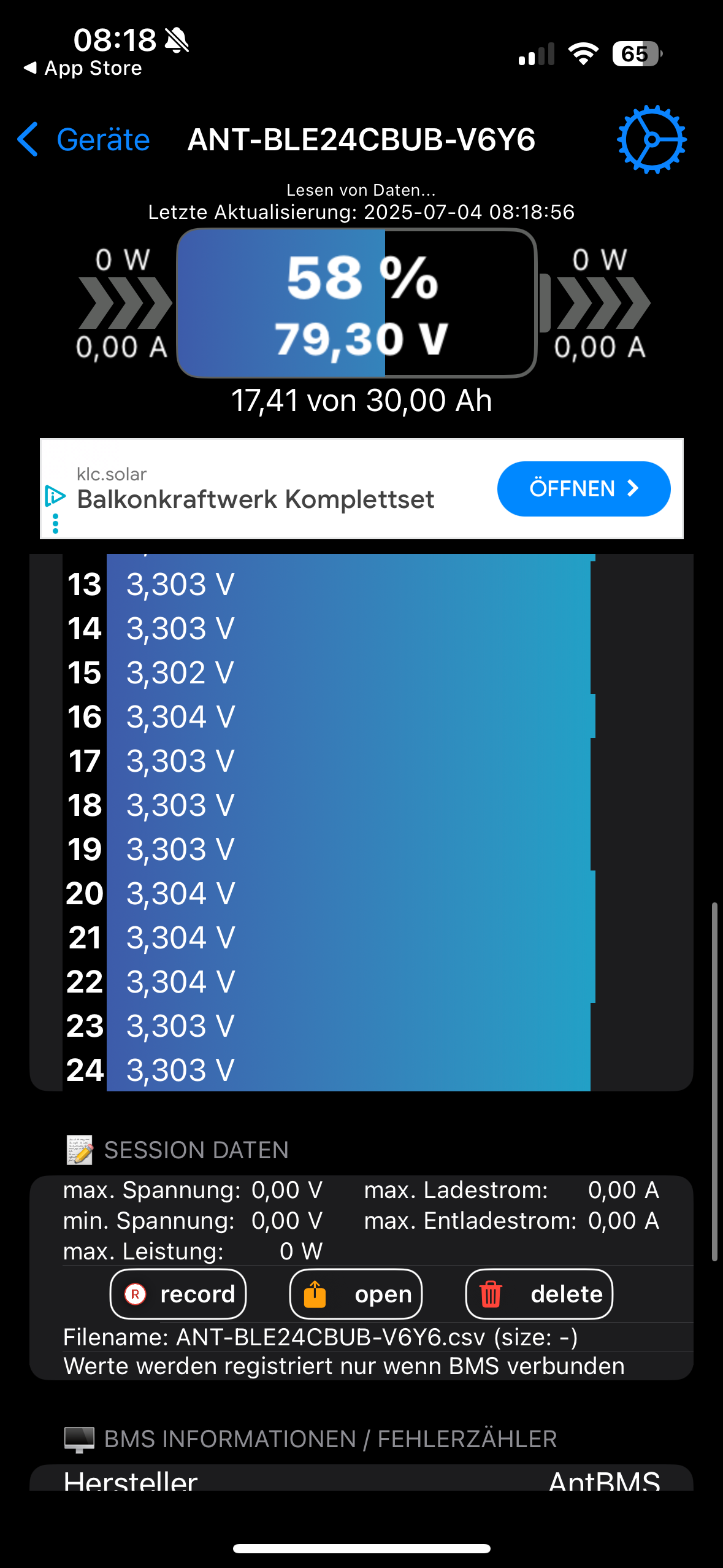 Bin auf den Trichter gekommen, mich in meinen BT Einstellungen meines Smartphones mit der Batterie zu verbinden. Finde ein „BMS-Ant…“ kann mich aber nicht koppeln :|