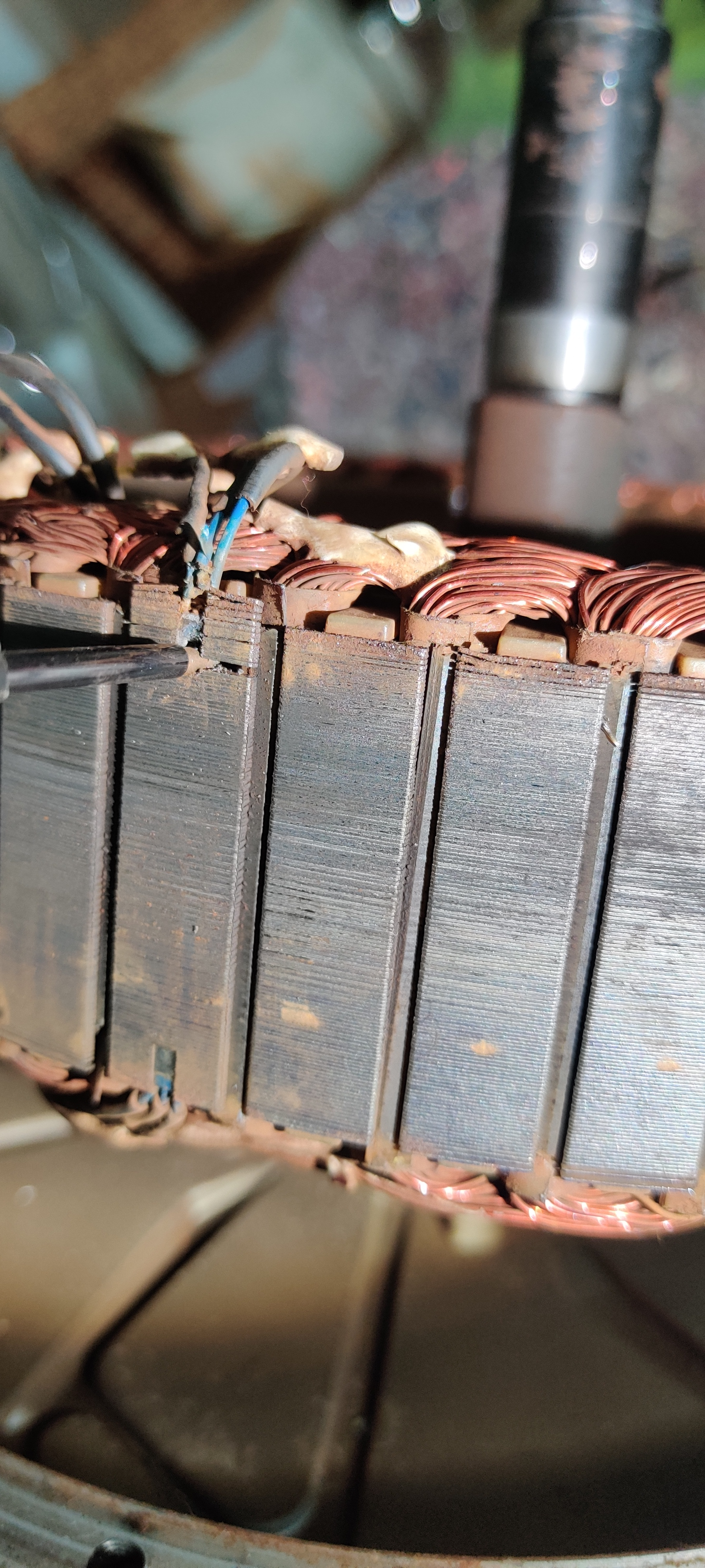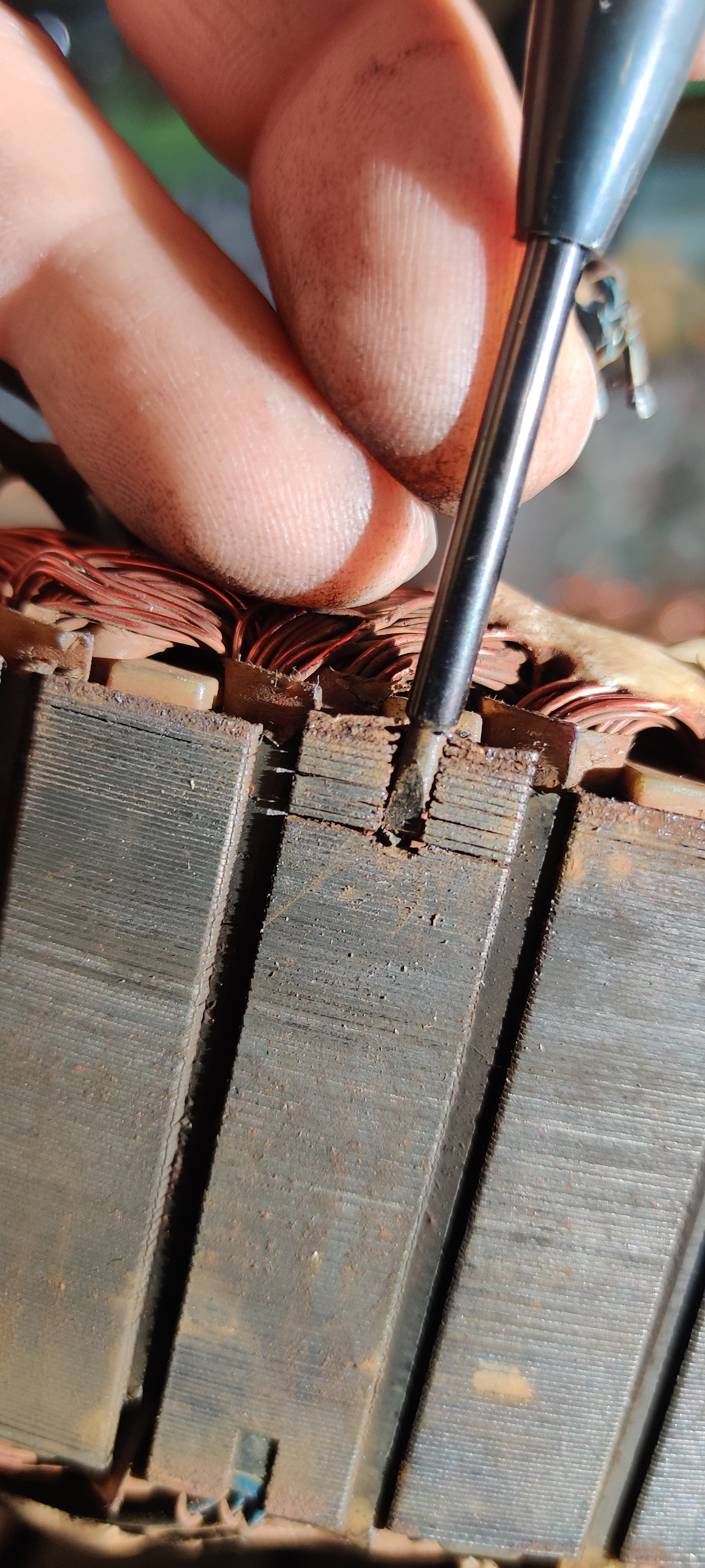 Man erkennt hier ganz gut, wie der Motor aufgebaut sind. Das Metall liegt in vielen dünnen Schichten aufeinander. Wenn man die Hall-Sensoren rausbekommen möchte, muss man ganz unten einen Schraubendreher (möglichst klein, Stromprüfer war bei mir zu groß) ansetzen und mit dem Hammer reintreiben. (Dezente Schläge)...