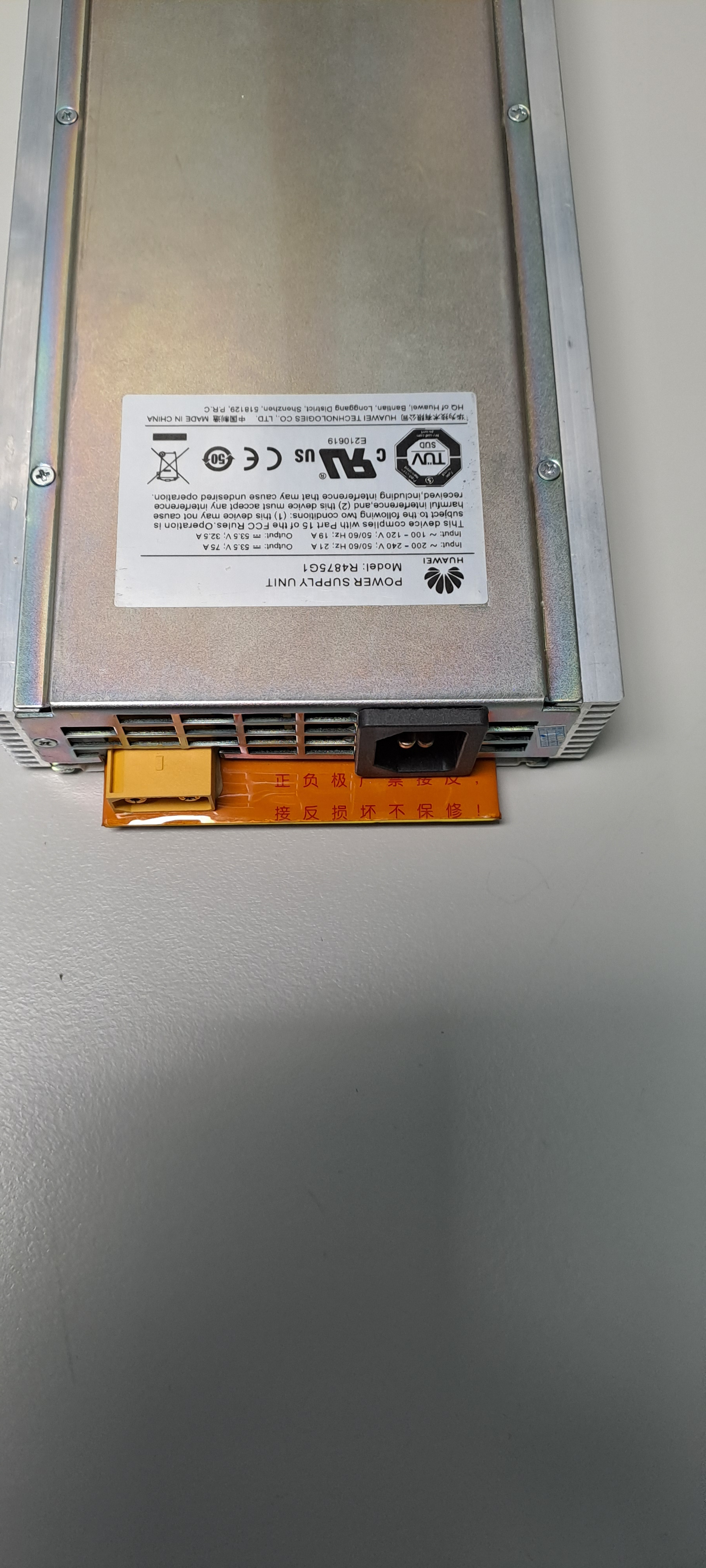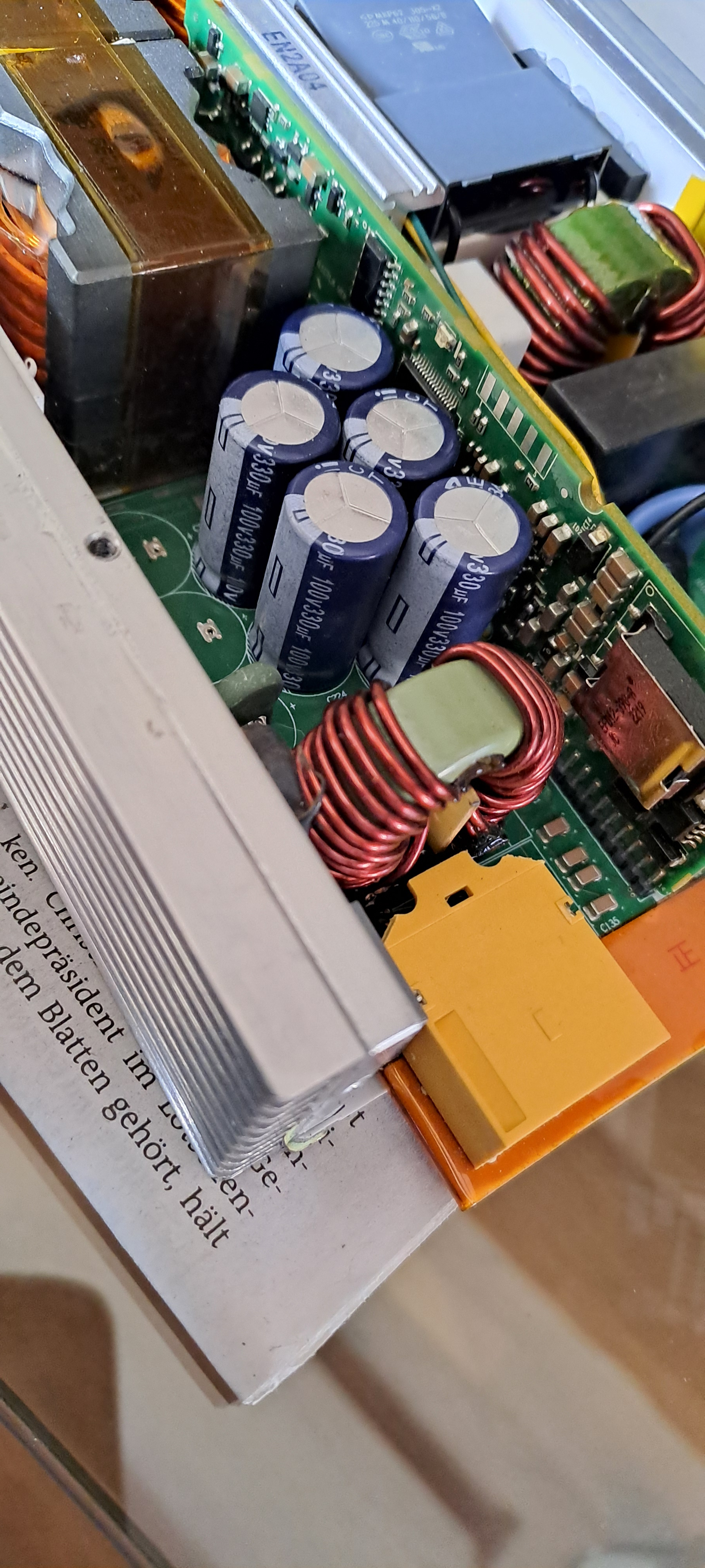 Die Änderung intern ist komplett anders realisiert als bei meinem vorherigen. Es gibt sichtbar nur 2 Leitungen welche in das Gerät eingreifen, vermutlich der CAN-BUS. Die Anpasssung der Spannungs- und Strommessung wie auch der geänderte Ausgangstrafo sowie die Elkos sitzen auf der originalen Huawei Platine.