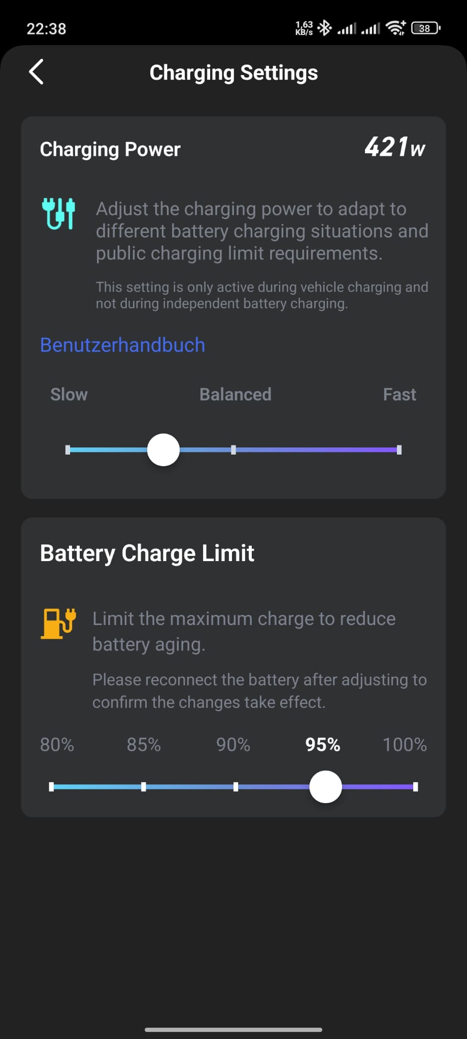 In der App lasst sich die Ladestärke stufenlos von 250-840 Watt einstellen.