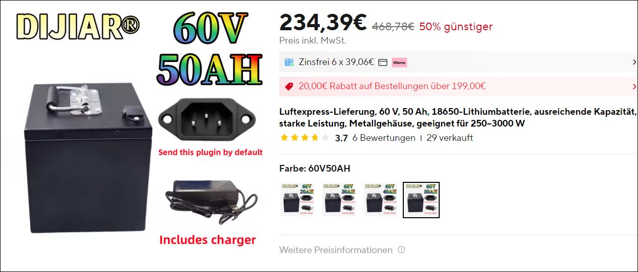 Luftexpress-Lieferung, Dijiar 60 V, 50 Ah, 18650-Lithiumbatterie 234,39€