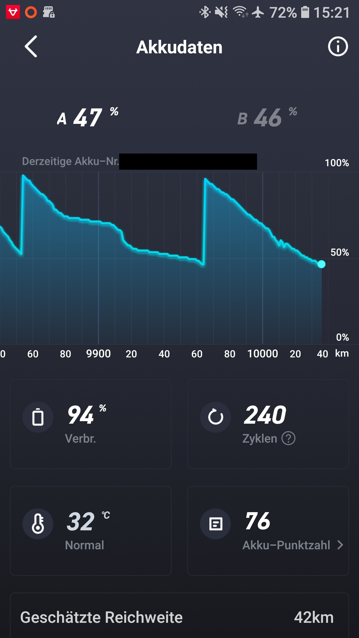 Die Akkus müssen noch nicht in Ruhestand, aber evtl. Altersteilzeit. Laut App reichen sie noch für 90 km. Im Mai bin ich mal 75 km (netto +260 Höhenmeter) am Stück gefahren und zuhause auf der Einfahrt hat der Akku dann bei 14% in Safe-Mode geschaltet. Aber für den Alltag noch lange brauchbar.