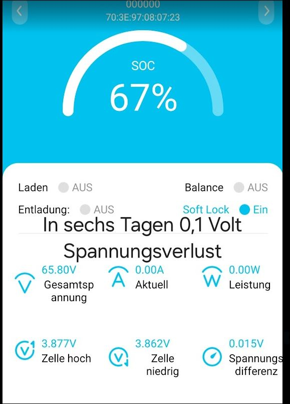 Hier der aktuelle Stand des Akkus, sehr erfreulich. Bei max ca 65 Volt beträgt der Spannungsverlust pro Monat unter 1,0 Volt. :D