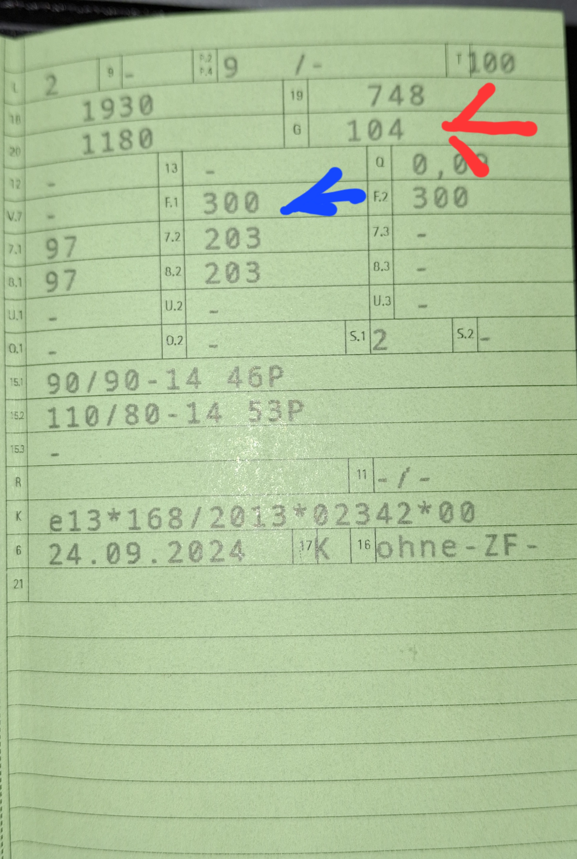 Im Fahrzeugschein stehen zulässige Achslast vorne 97kg, hinten 203kg