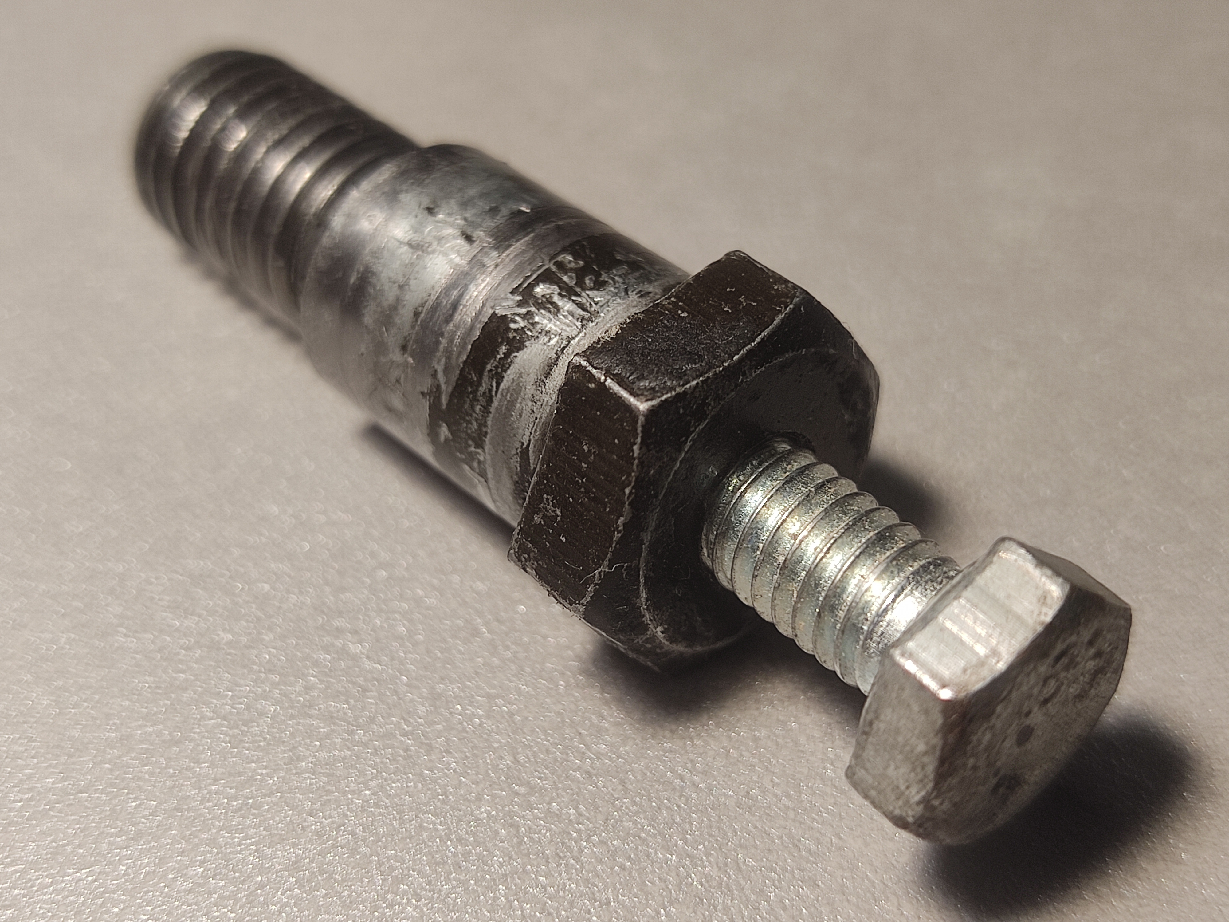 Der Schalter wird von hinten mit einer in den hinten hohlen Seitenständerbolzen geschraubten Schraube gehalten. Die Schraube ging mir irgendwie verloren. Eine M6x15mm passt. Länger darf sie nicht sein, sonst sitzt sie im Sackloch auf.