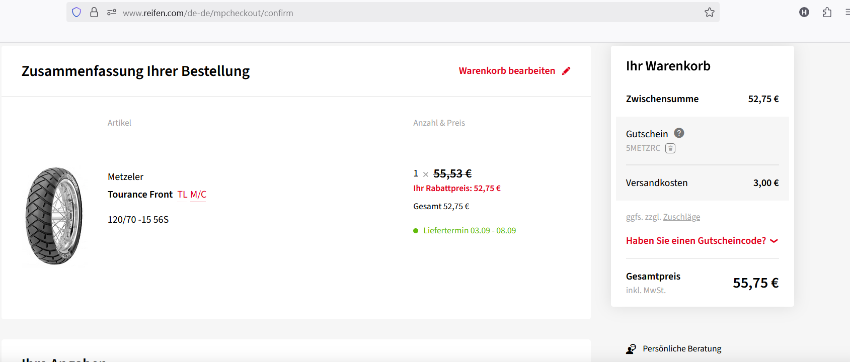 Mein BMW Händler hat mir nun zwei neue Pirelli Diablo Rosso Scooter um €343 inkl. Montage angeboten.